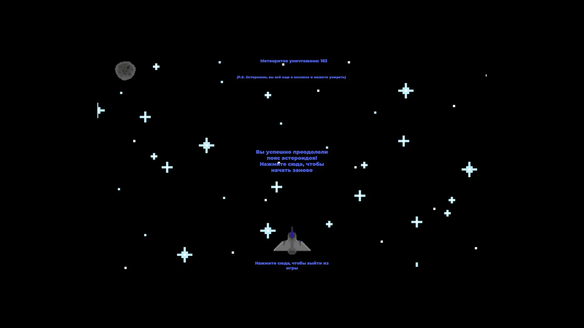Космические путешествия - это красивая фантазия, но у большого путешествия большие опасности. Предлагаю вам показать свою решимость, храбрость и манёвренность, преодолейте пояс астероидов живыми! Помните, что малейшее повреждение корабля в космосе ведёт к потенциальному провалу экспедиции в космосе.