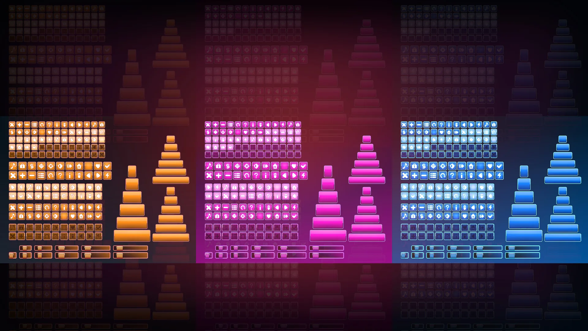 Package of buttons, sliders and panels in 3 colors (Yellow, Purple, Blue),