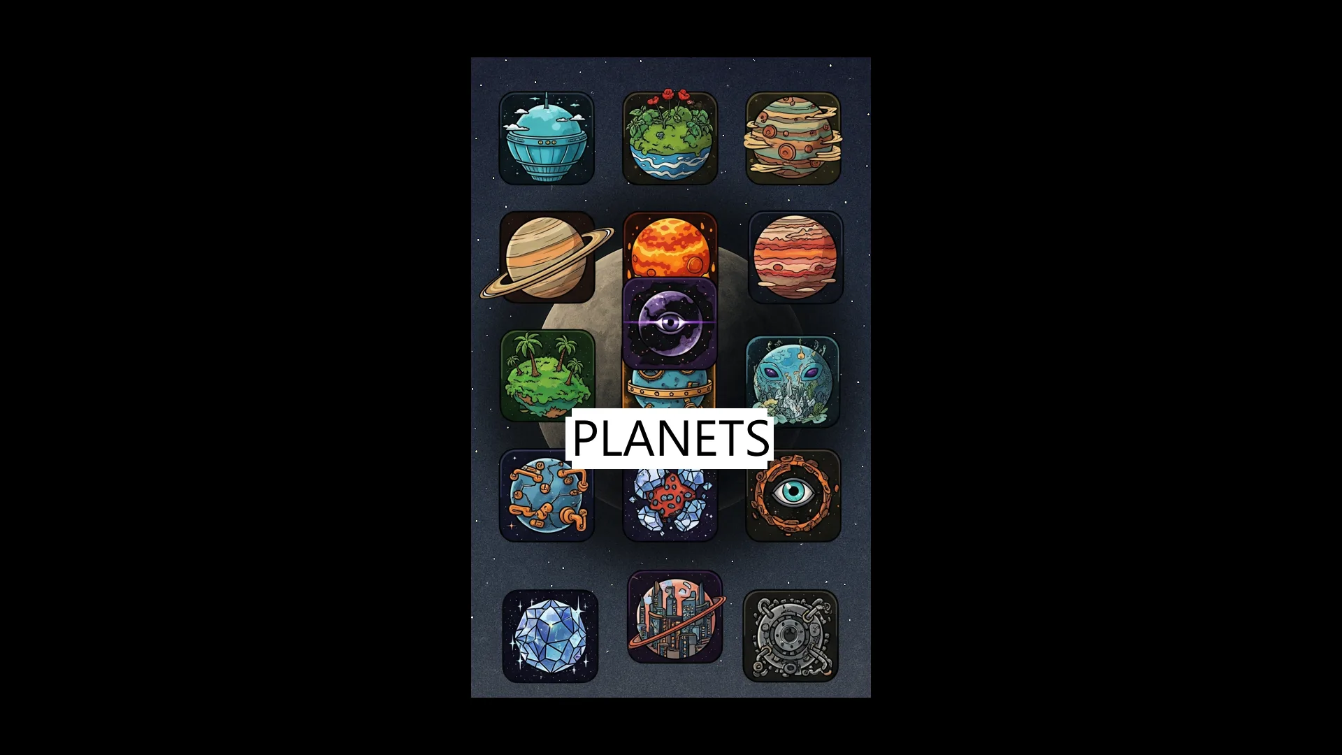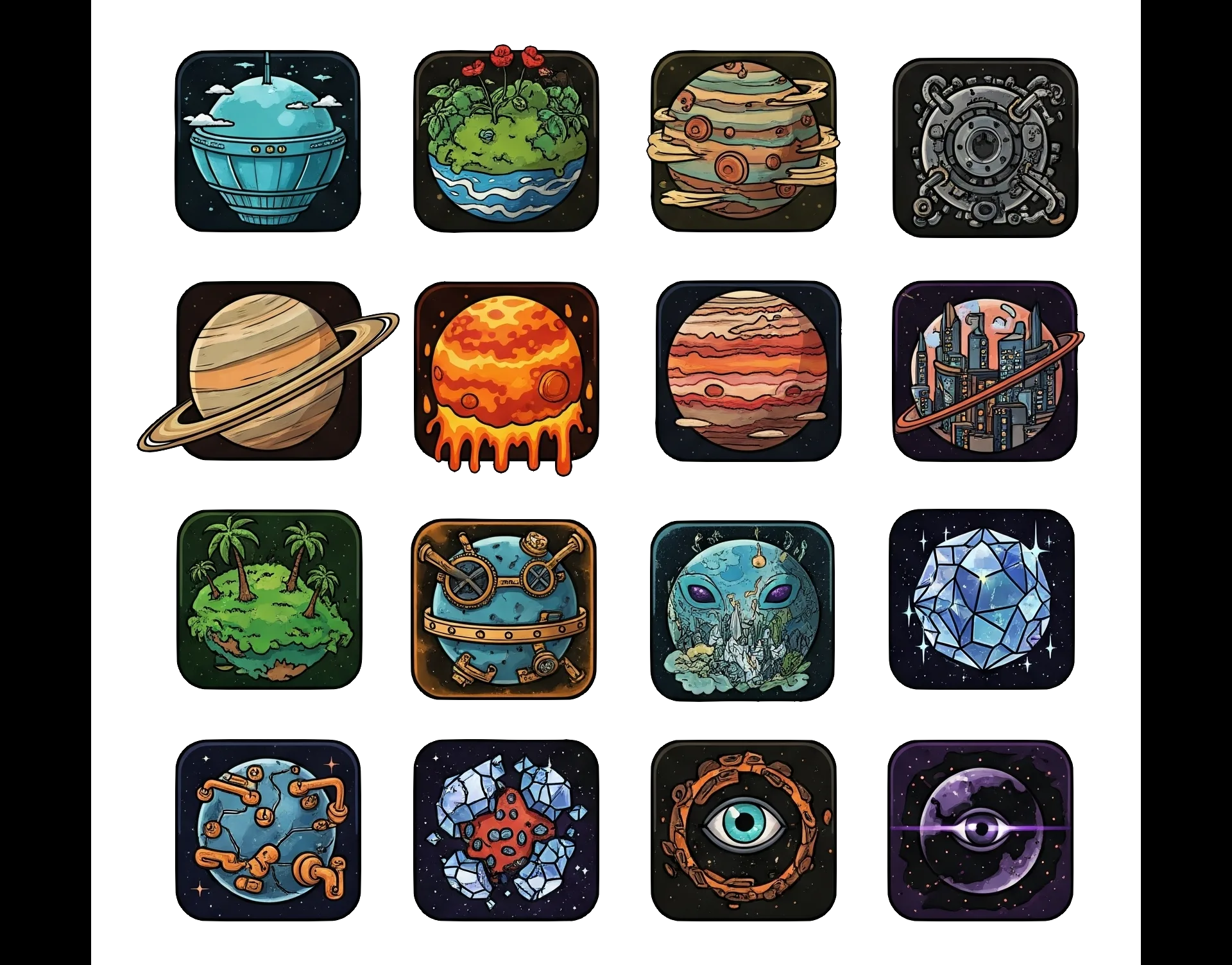 Набор из 16 иконок планет — от каменистых и покрытых кратерами до газовых гигантов с кольцами и светящимися атмосферами. В коллекции есть и классические землеподобные миры, и фантазийные с уникальными узорами, океанами или лавовыми трещинами. Каждая иконка детально проработана и сохраняет узнаваемый характер небесного тела, создавая цельный визуальный стиль космической коллекции.