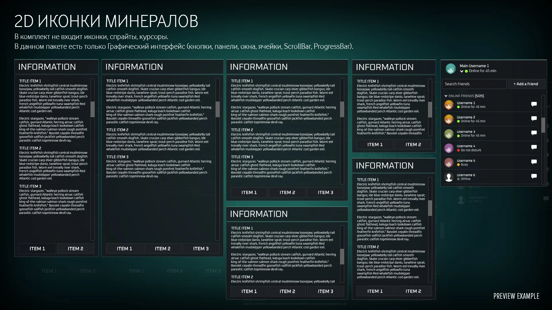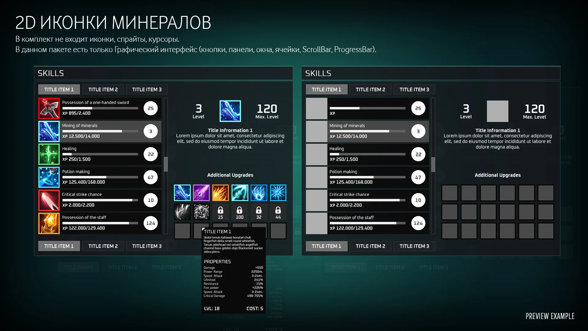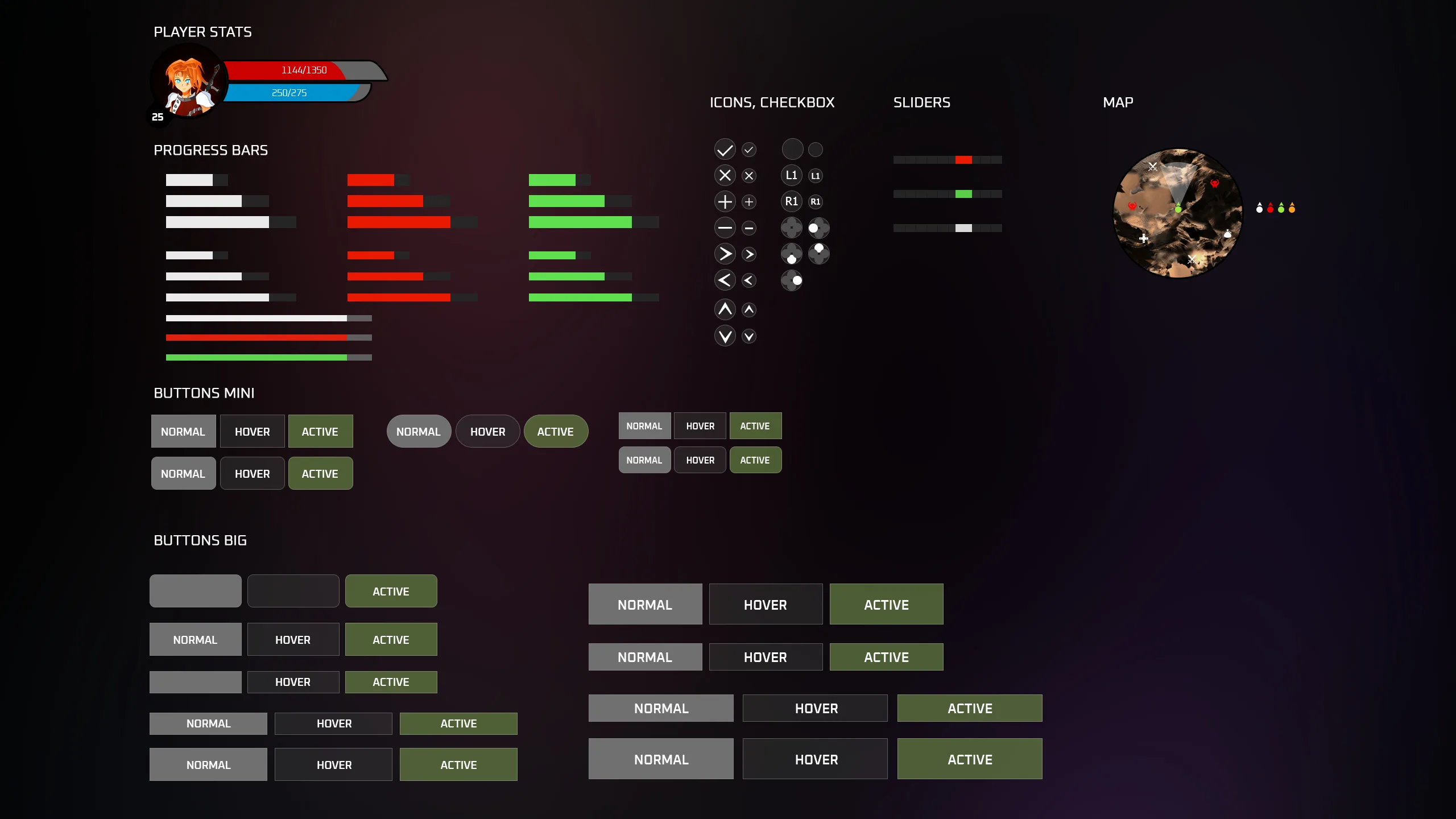 The biggest GUI I've ever done. Here you can find quite a variety of elements for creating your own interface or using standard template options that are presented in the screenshots. The set does not include high-quality ability badges (Vegetables, Fruits, etc.), you can purchase them separately.
