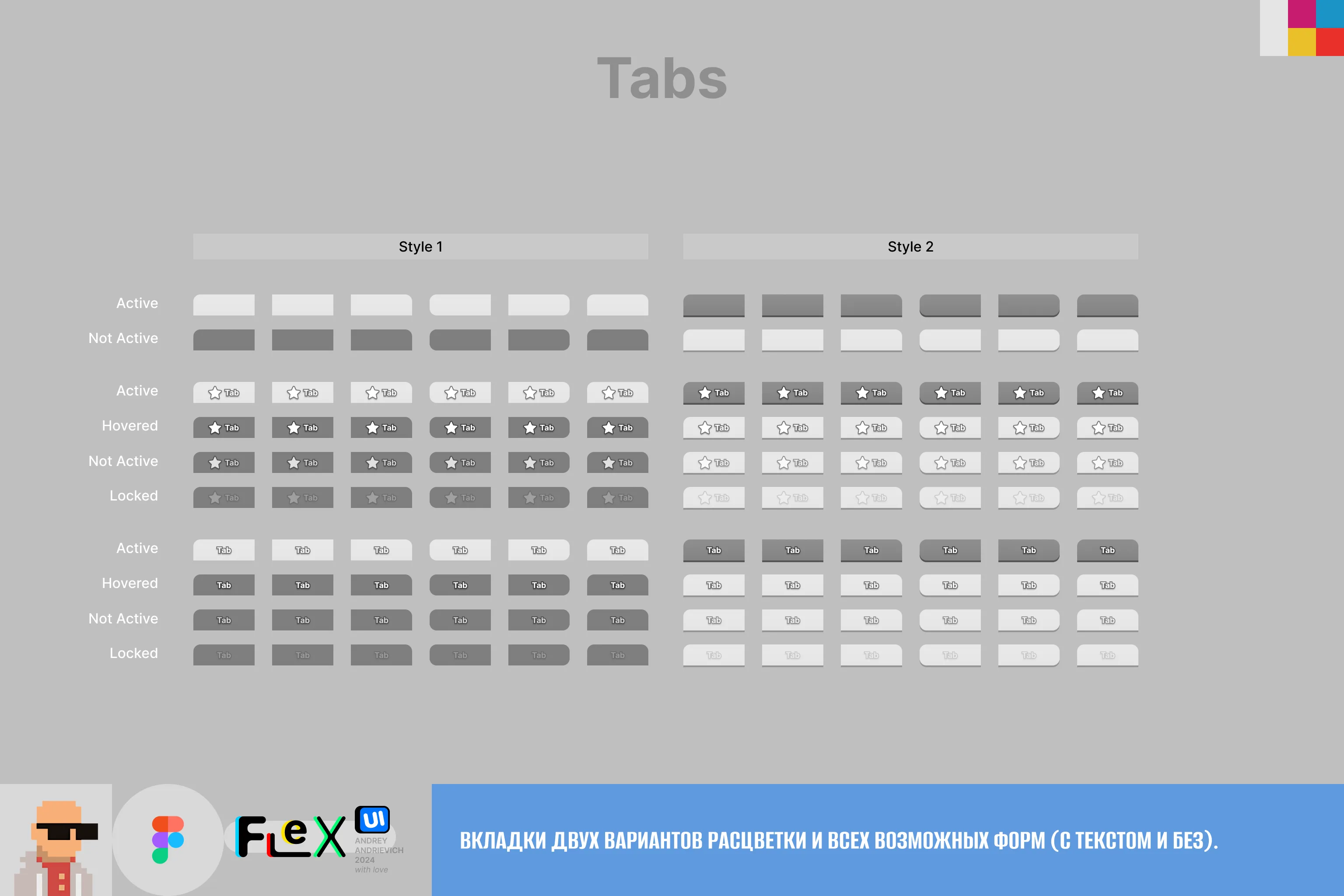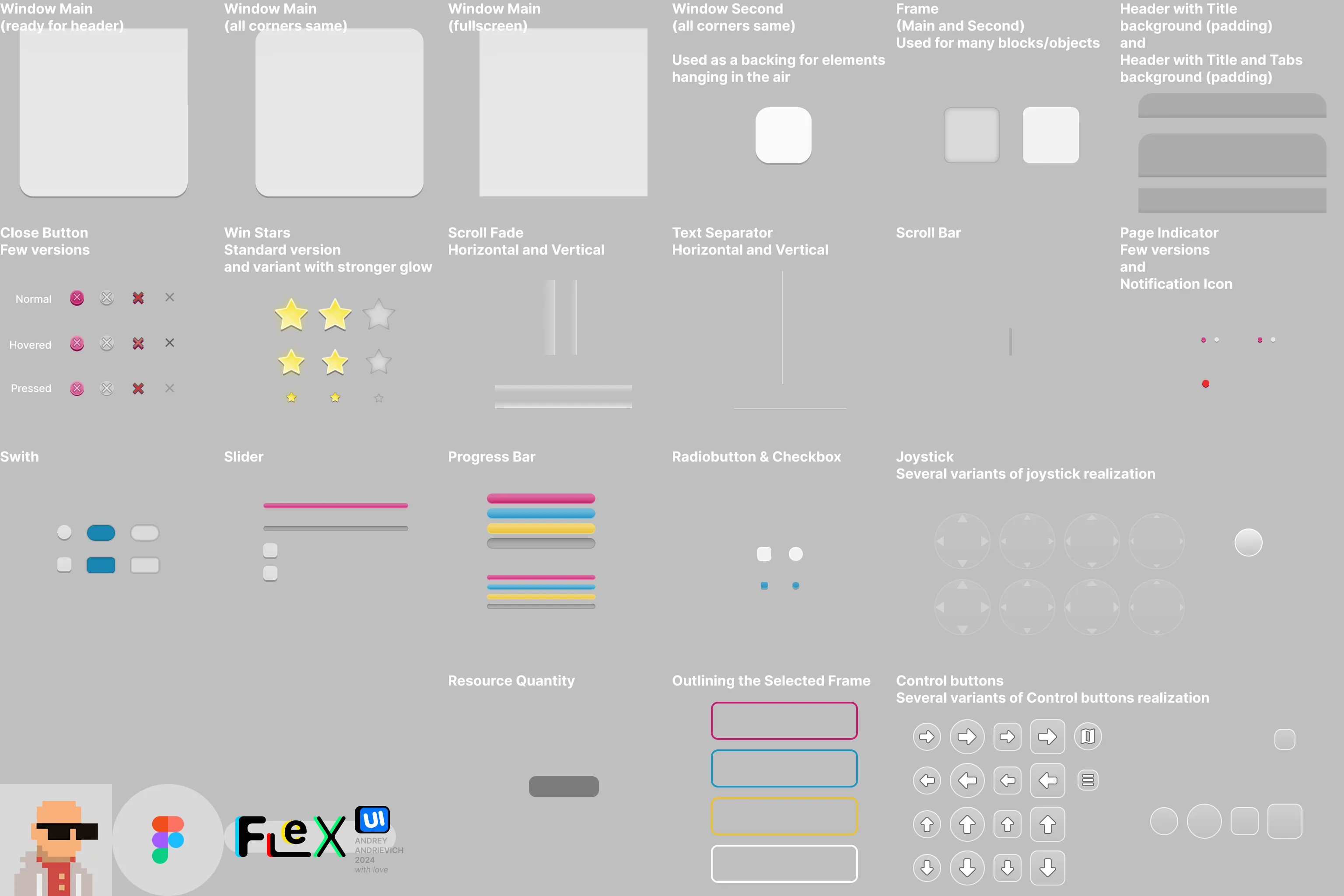 - All elements necessary for interface creation: buttons, tabs, switchers, sliders, progress bars, frames, checkbox and radiobutton, bubble prompts, joysticks and other control buttons, font styles (inside Figma file), swipe and scroll indicators and many others. Some elements have several implementation variants.