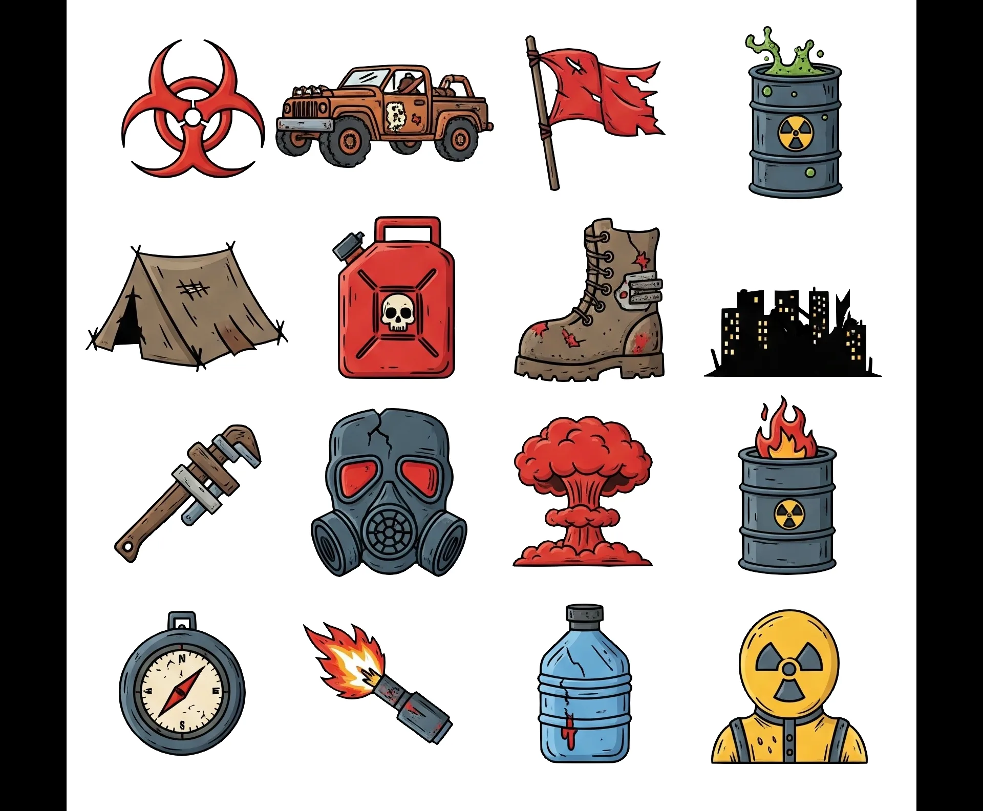 Набор из 16 иконок в постапокалиптической стилистике: оружие, снаряжение, знаки опасности, остатки быта и элементы выживания. Минималистичная подача с чёткими формами делает иконки легко читаемыми и универсальными для интерфейсов игр, карт и приложений.