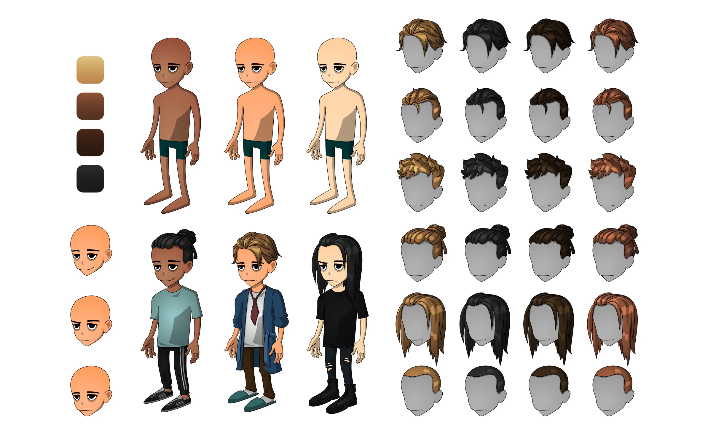 Свободный ассет с прическами, одеждой, эмоциями и цветами кожи для персонажа, подойдет для игры-одевалки или на ваше усмотрение:)