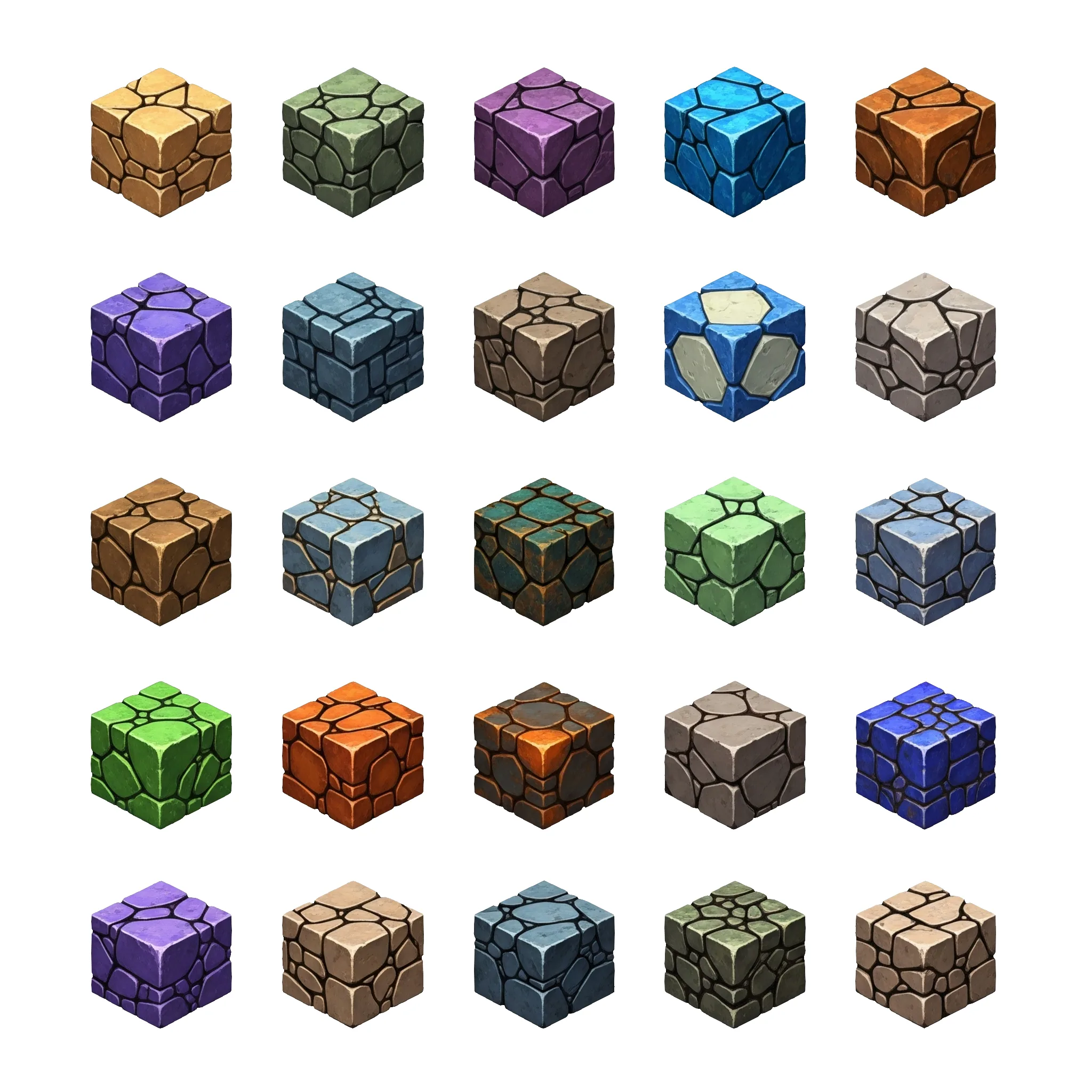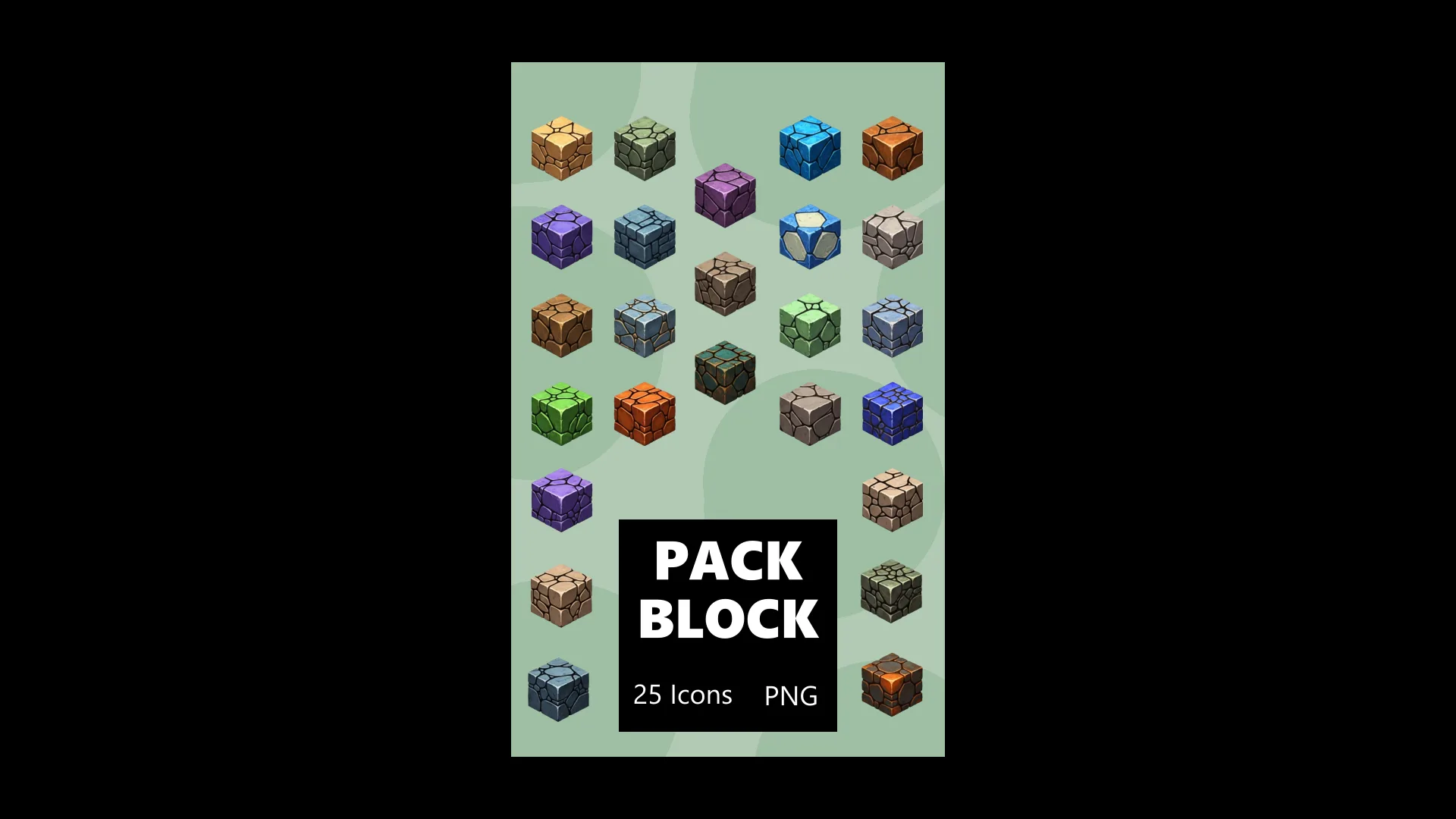 В наборе 25 иконок блоков. Идеально подойдут для интерактивной игры, где требуется текстура каменной, песчаной, вулканической, металлической плитки. Это позволит вам разнообразить дизайн локаций, построек и данжей!