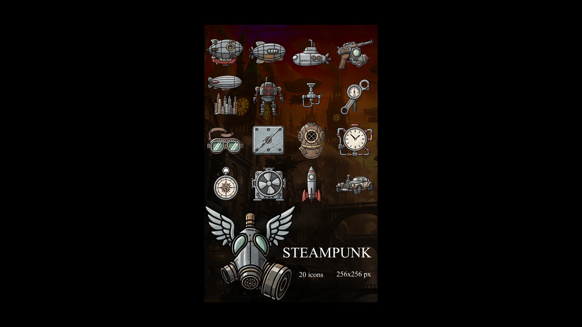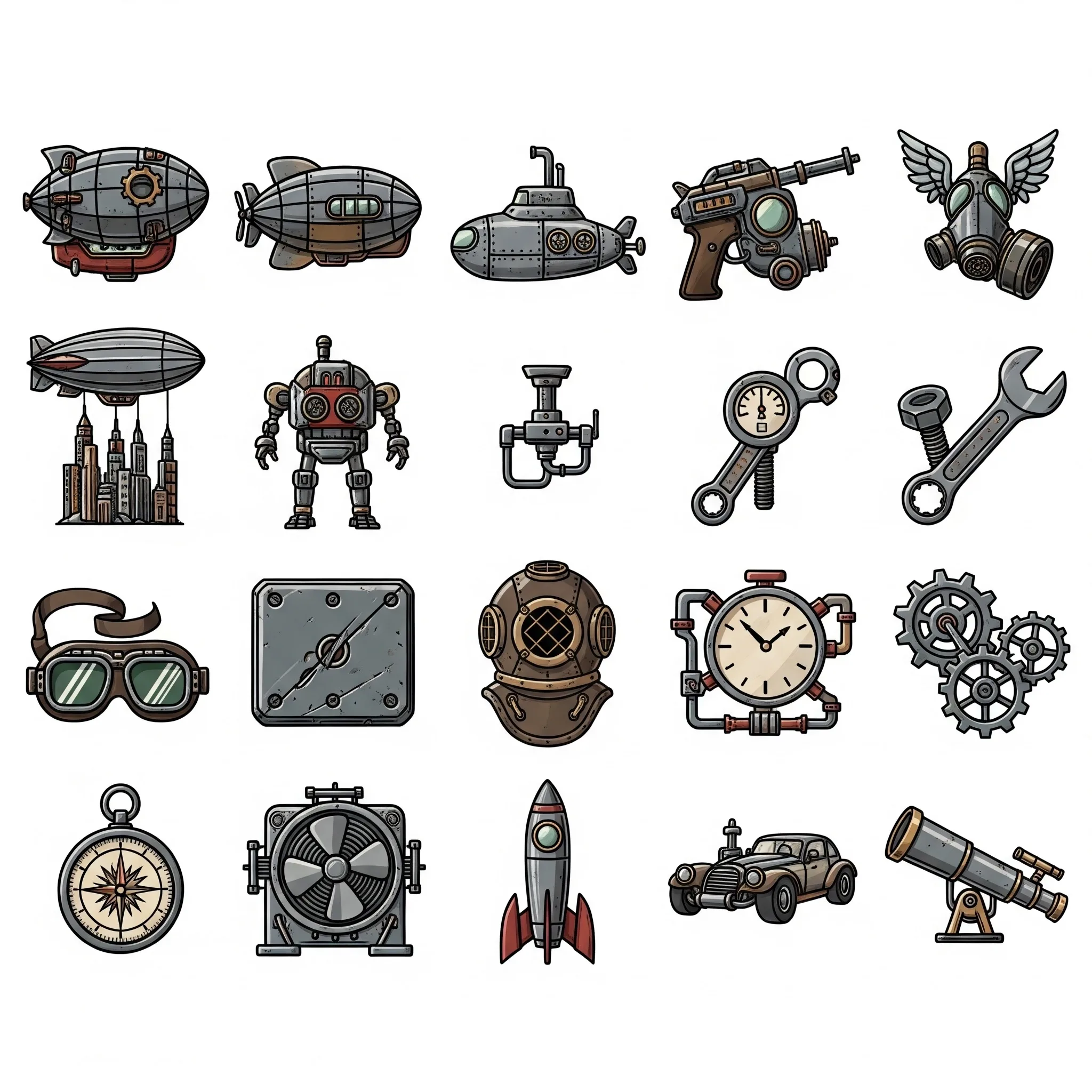 Набор из 20 иконок стимпанка — от шестерёнок и паровых машин до механических очков и карманных часов. В коллекции есть даже мини-дирижабль и механические детали, подчёркивающие необычность и атмосферу жанра. Каждая иконка детально проработана и сохраняет узнаваемый характер стимпанк-эстетики: металл, латунь, трубы и пар сочетаются в цельный визуальный стиль.