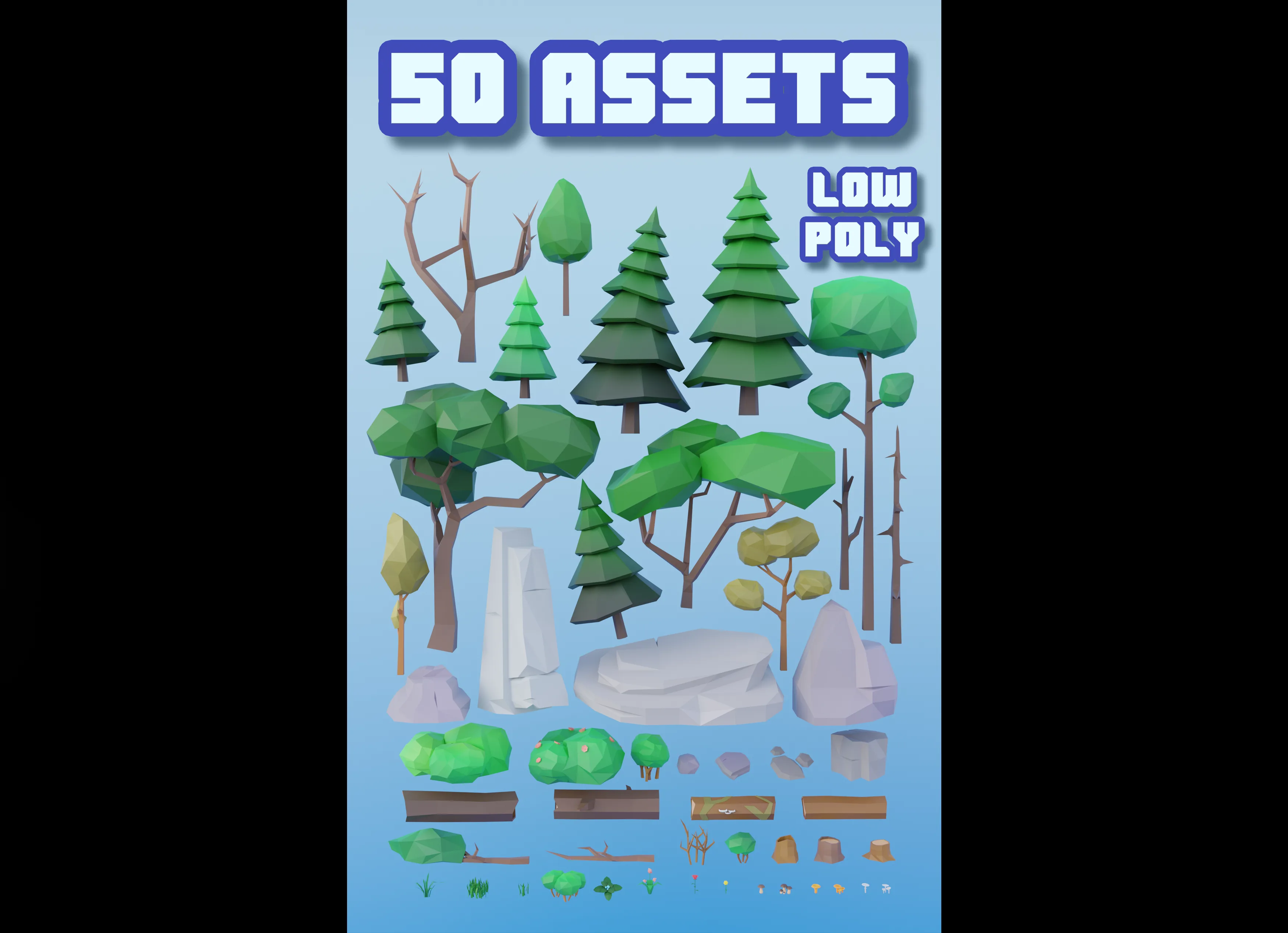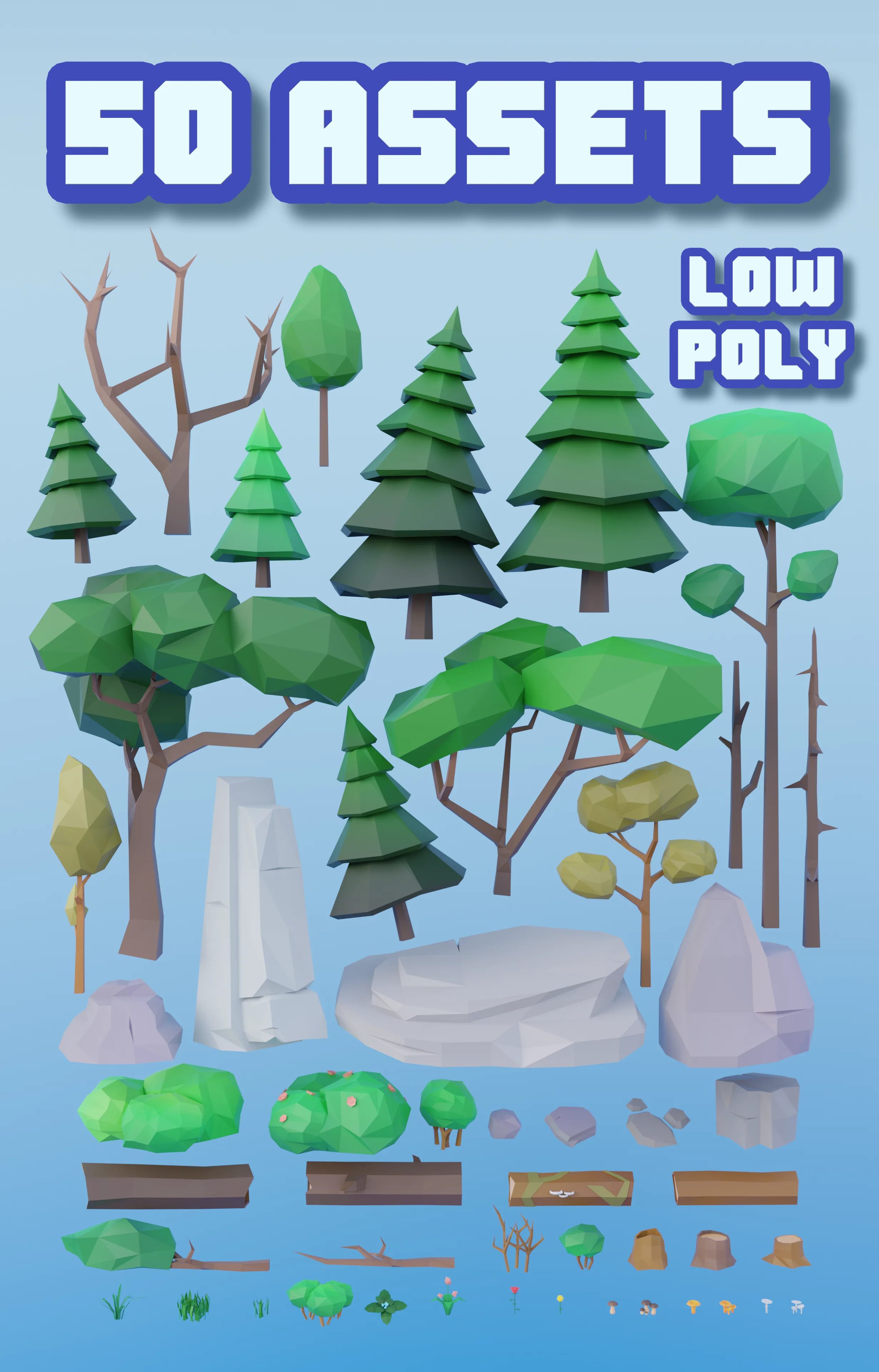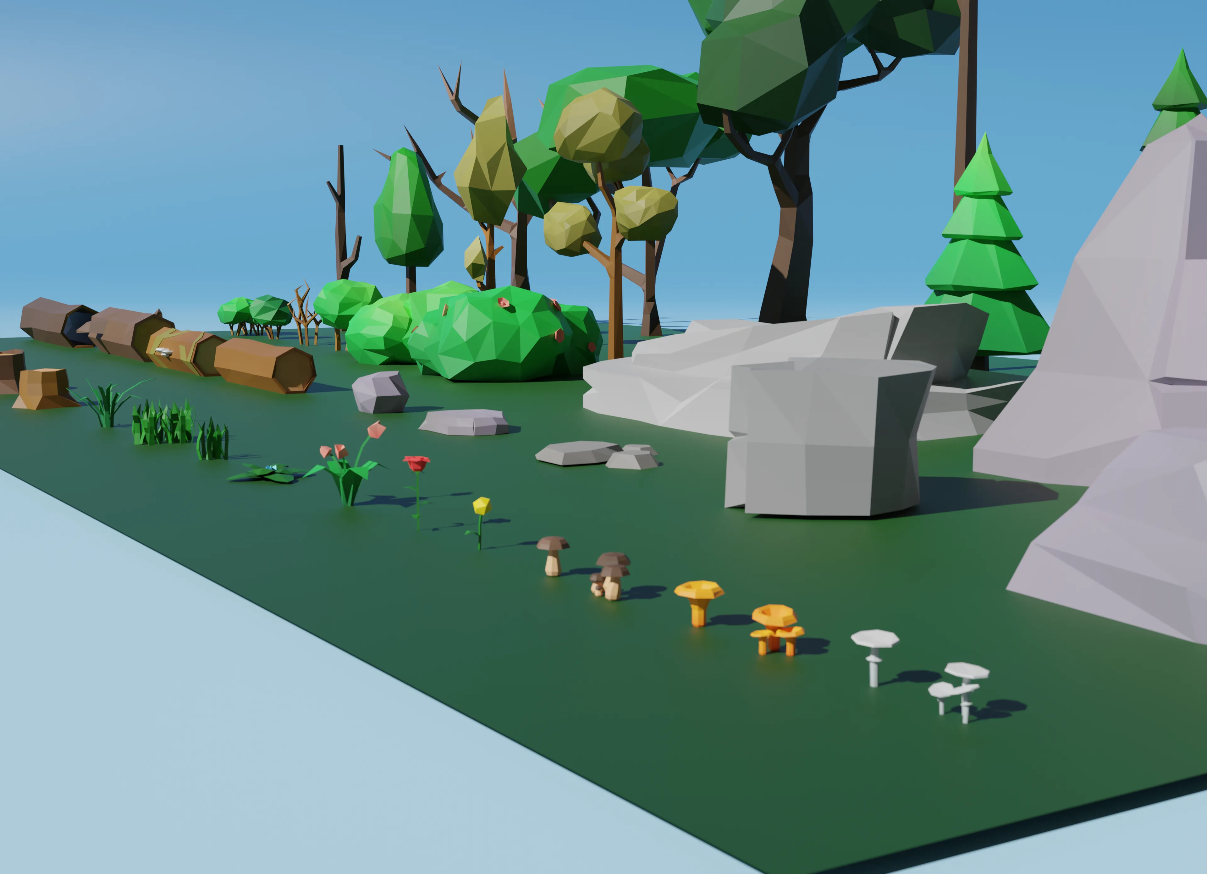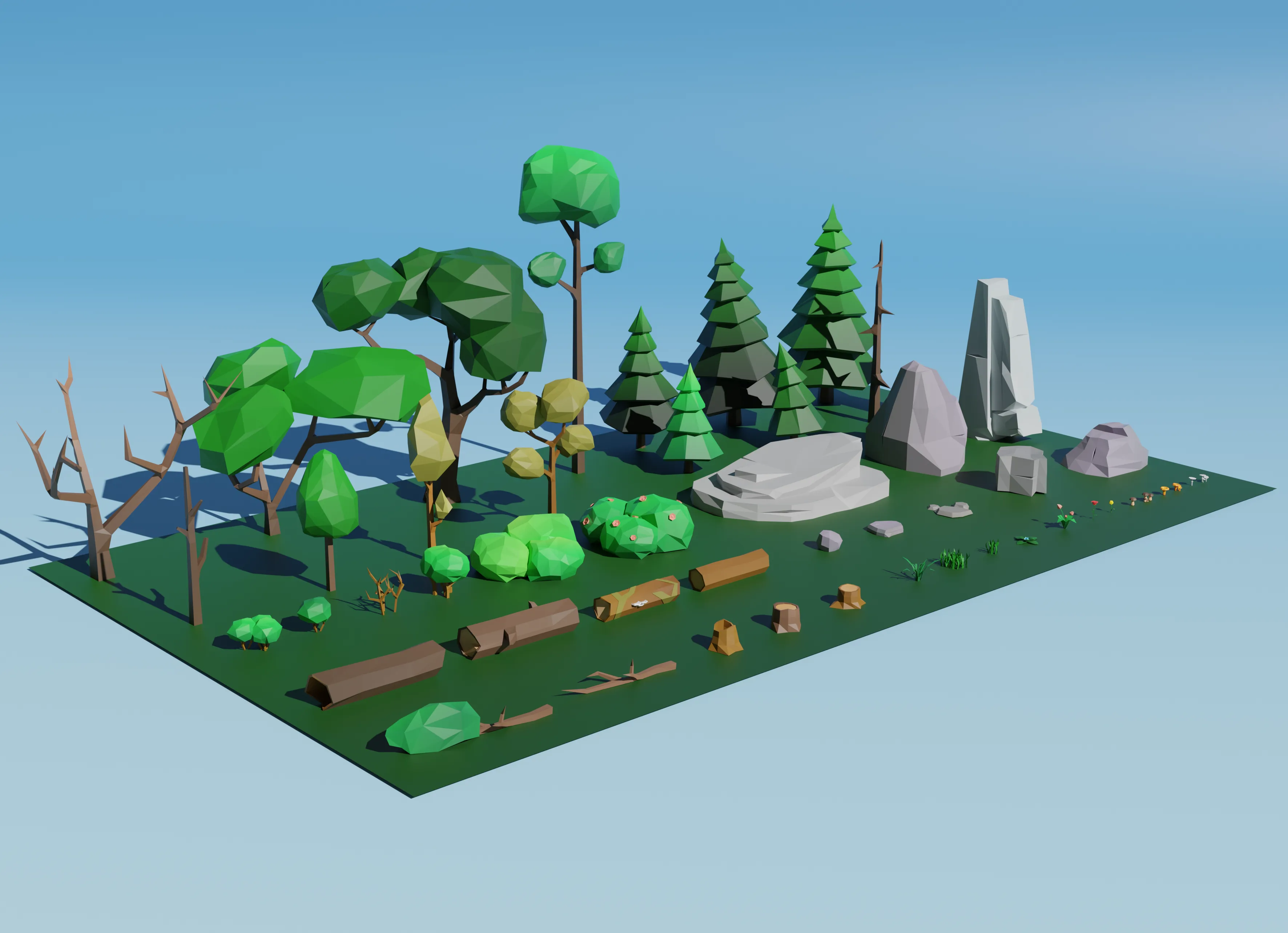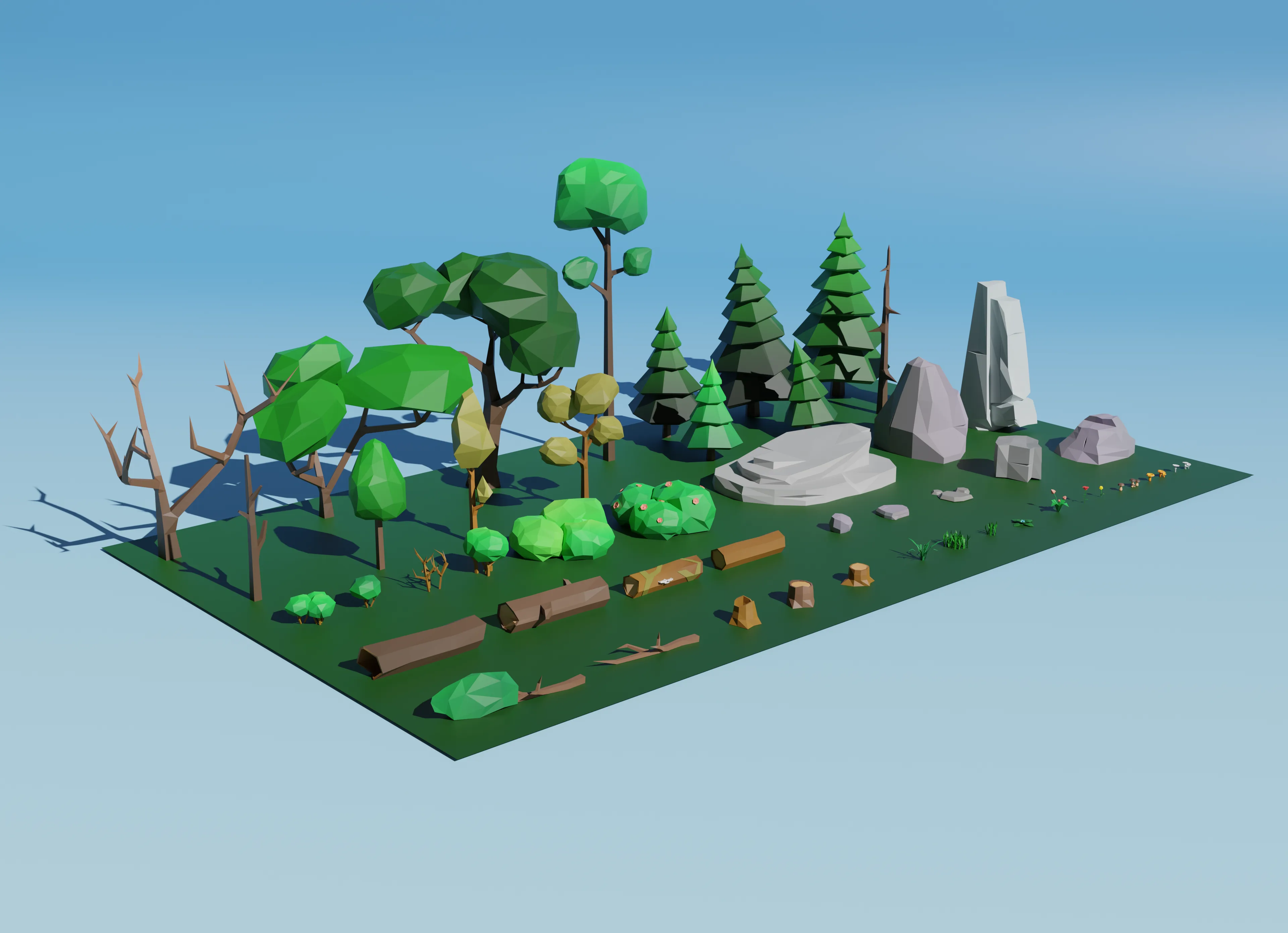 Lowpoly-набор состоит из деревьев, веток, бревен, пеньков, грибов, кустов, камней, цветов, травы. Отлично подойдет для вашей игры, в использовании создания сценок и другое. Архив содержит модели в формате FBX, OBJ, DAE, BLEND, а также текстуру в формате png.