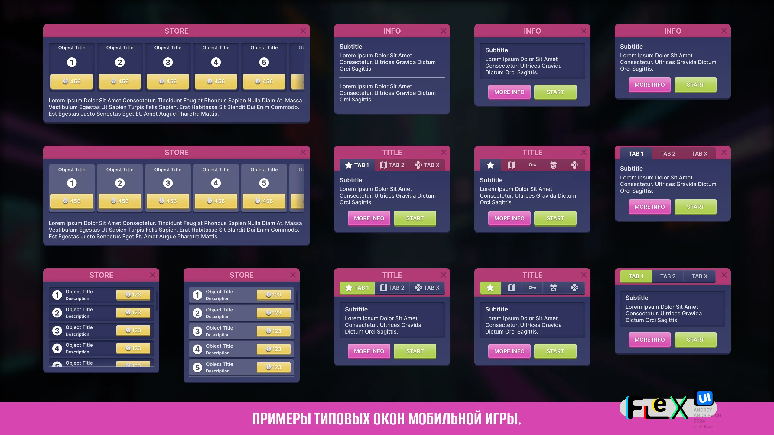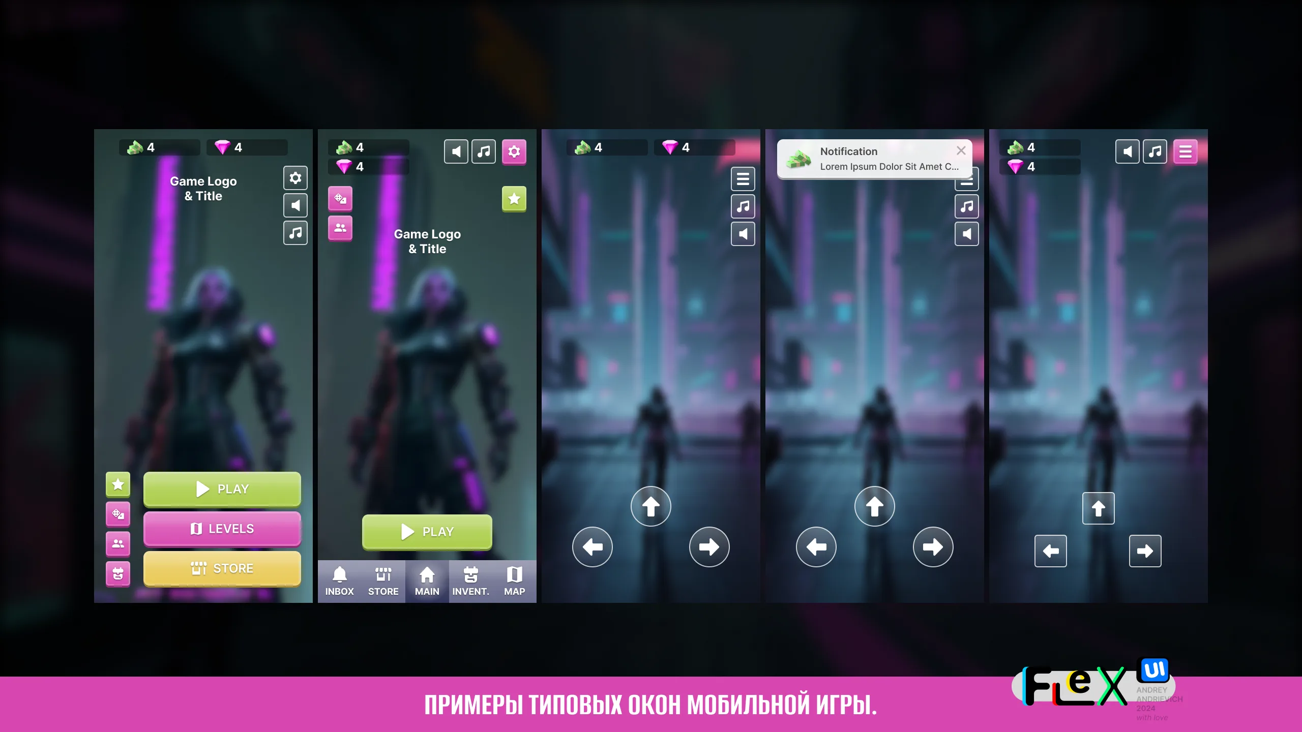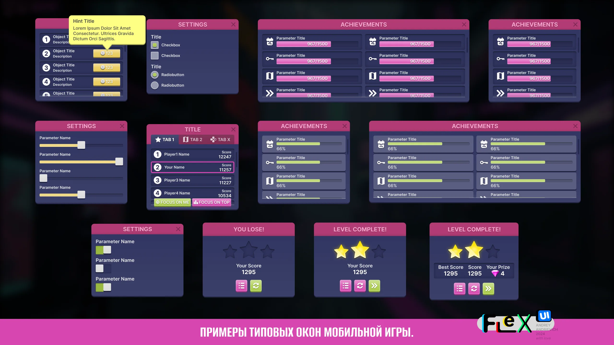 UI Kit for your game with examples of the main windows of a typical mobile game (MORE than 70 examples).