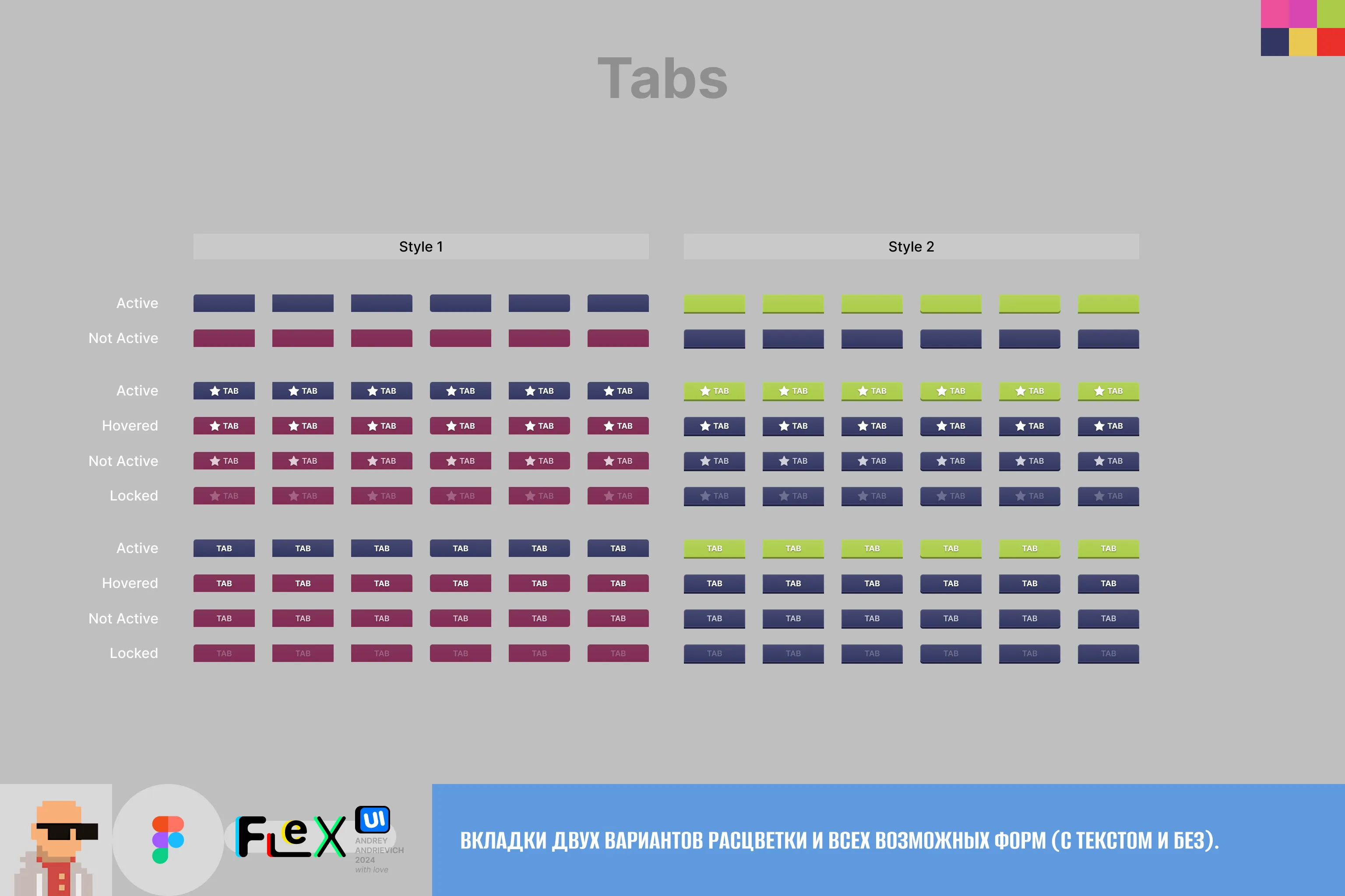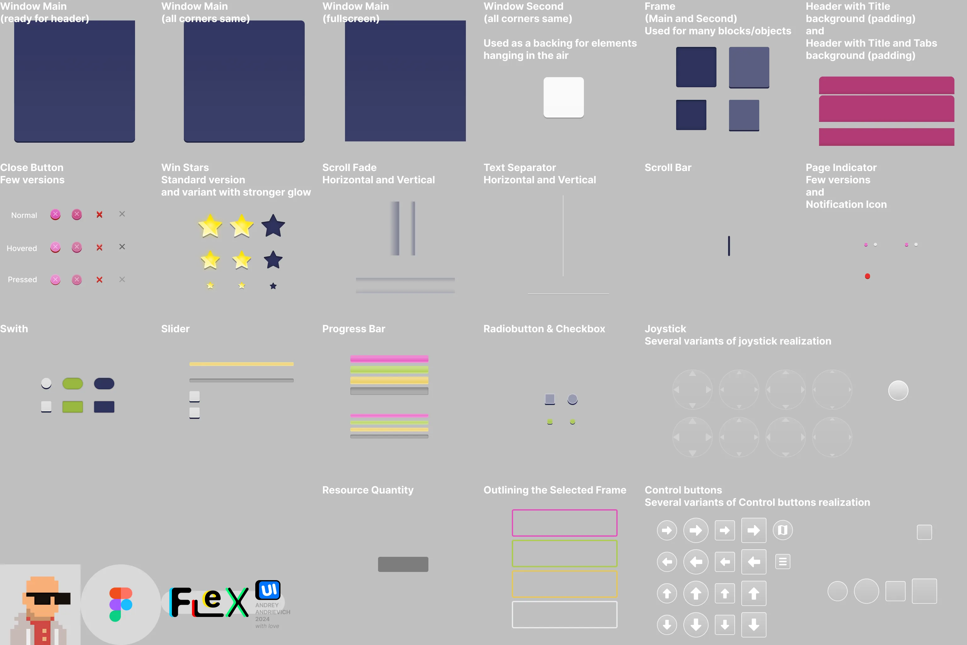 - All elements necessary to create the interface: buttons, tabs, switchers, sliders, progress bars, frames, checkbox and radiobutton, bubble prompts, joysticks and other control buttons, font styles (inside the Figma file), scrolling and scrolling indicators, and much more. Some elements have several implementation variants.
