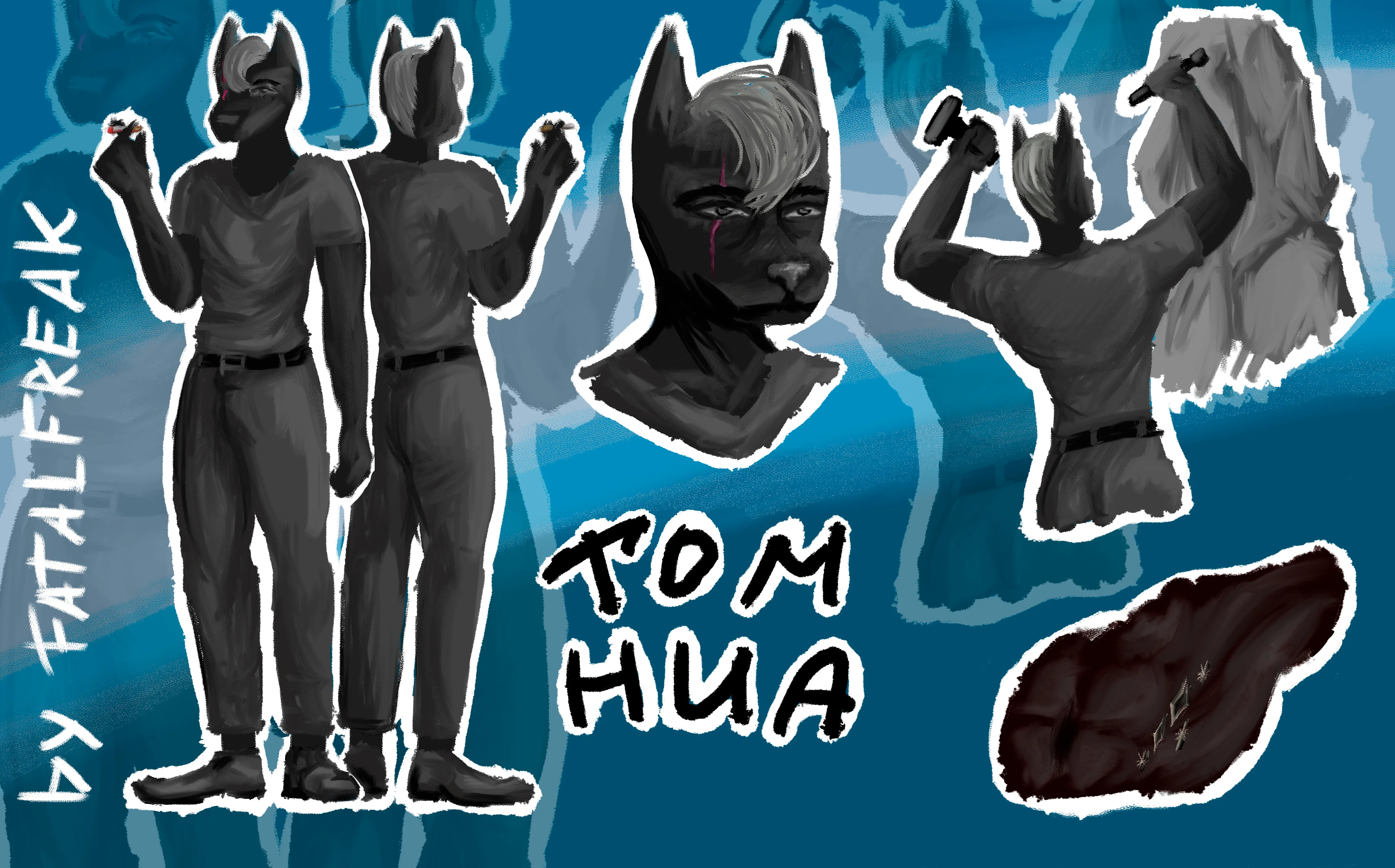 Черная шерсть Тома Хуа покрывает все его тело, идеально подчеркивая его выразительные черты лица и тела. Его глаза, полные глубины и эмоций, являются настоящим центром притяжения. Однако, на теле Тома есть шрамы – некоторые из них были получены в результате неудачной обработки мрамора во время работы над своими скульптурами, другие же – это татуировки, сделанные его друзьями тату-мастерами. Эти шрамы лишь добавляют ему характера и индивидуальности.