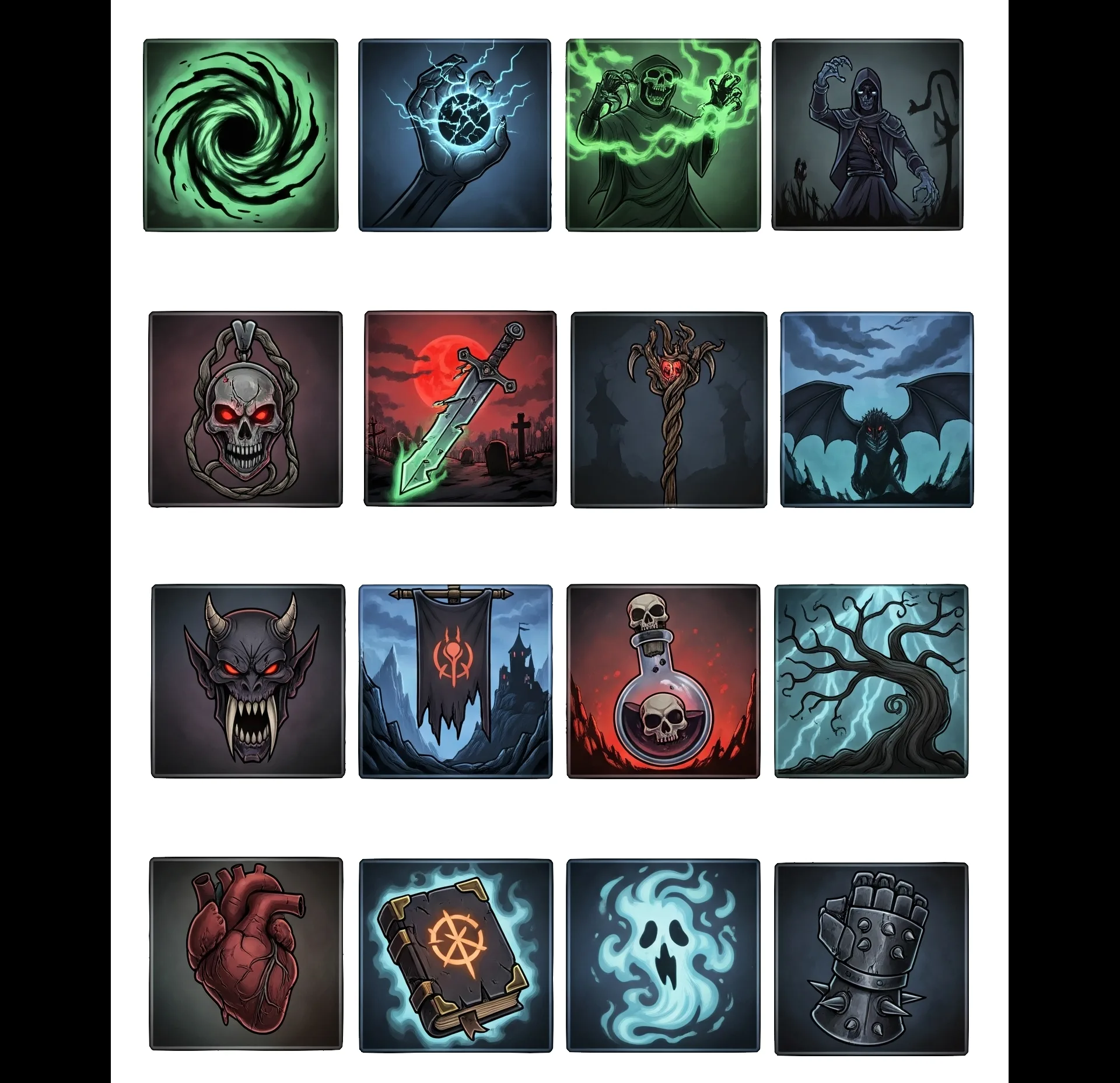 В наборе 16 иконок способностей в стиле DARK FANTASY. Благодаря представленным в паке изображениям, вы сможете КРАСИВО оформить свой проект! Сделав навыки, интерфейс, достижения более атмосферными и лаконичными!