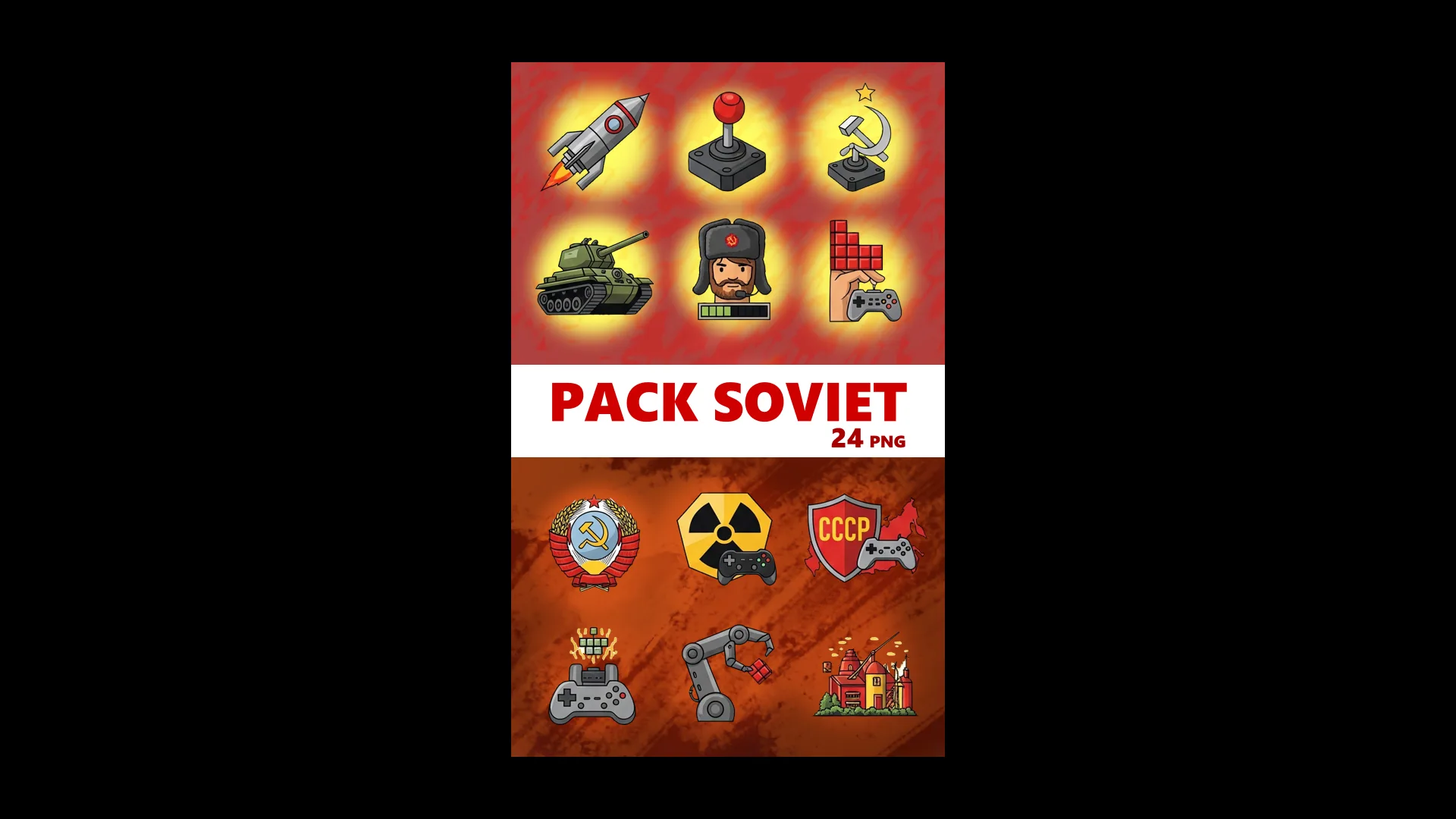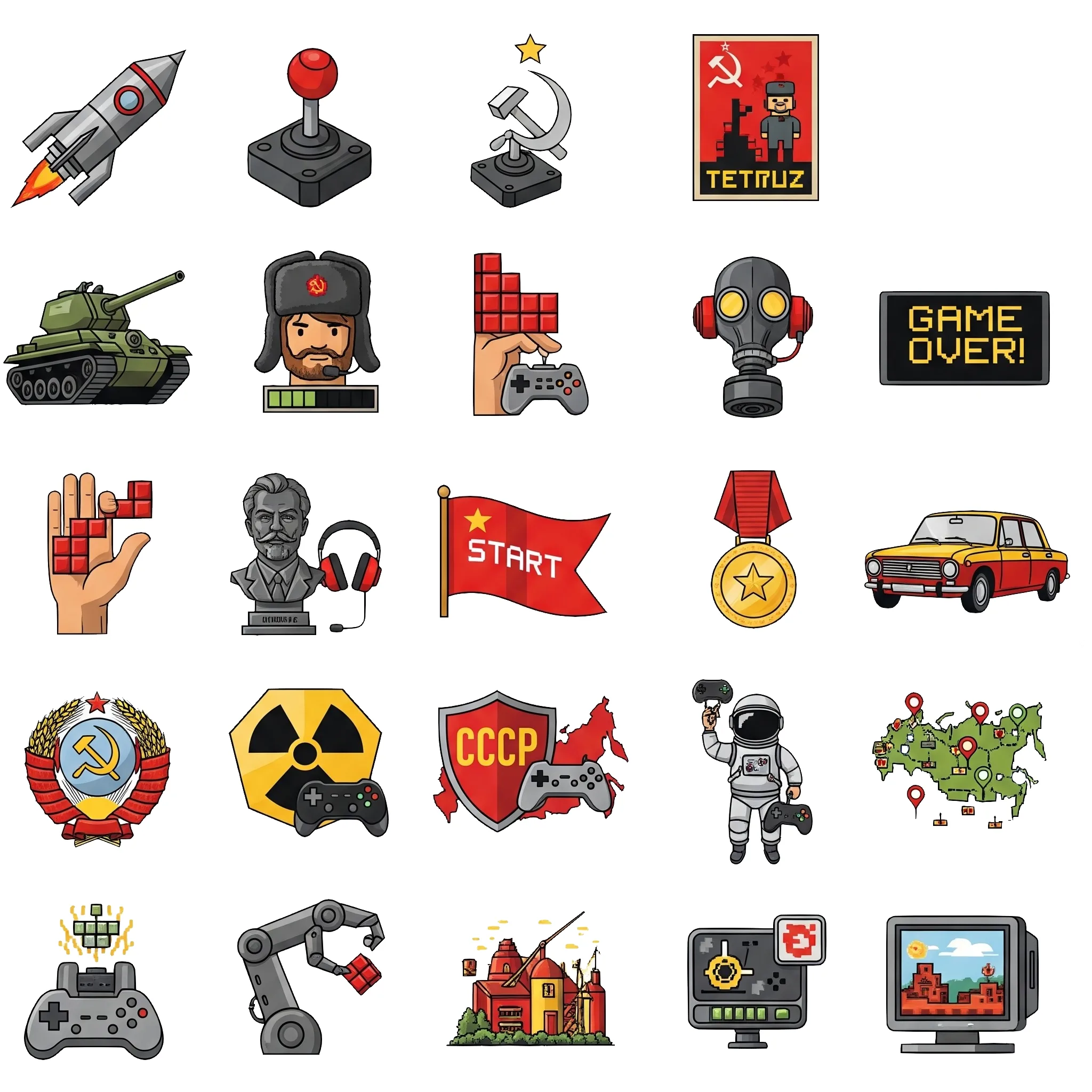 Набор из 24 иконок в советской тематике: предметы, символы и техника эпохи, выполненные в яркой игровой стилистике. Каждая иконка детализирована, с лёгким акцентом на мультяшность и понятный силуэт, что делает их удобными для интерфейсов и интерактивных проектов.