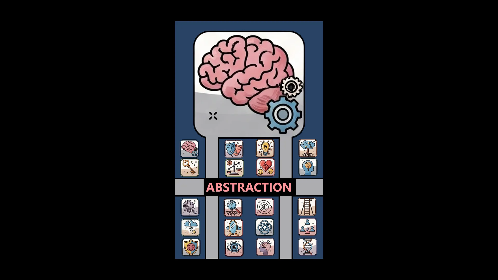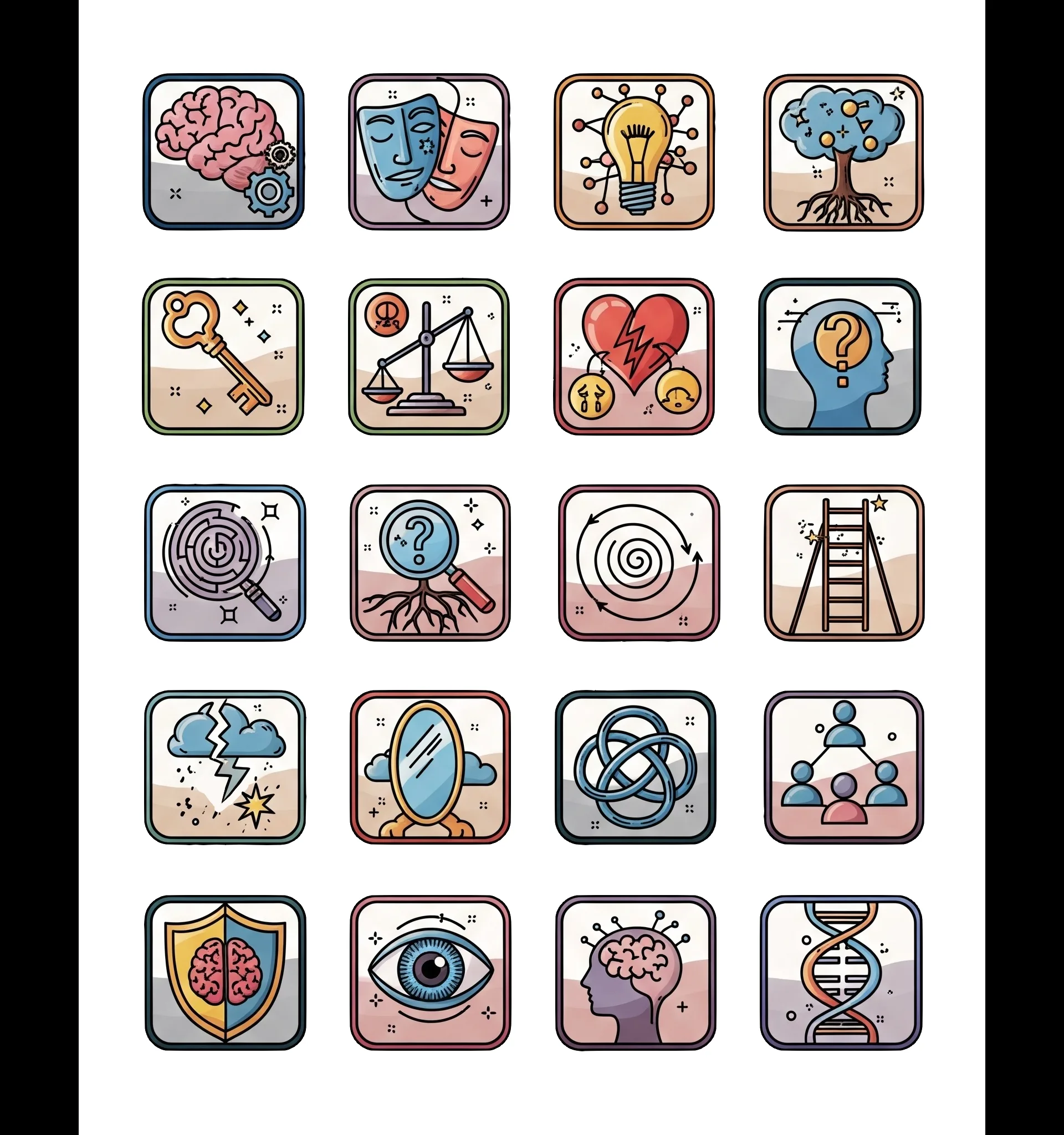 Набор из 20 абстрактных иконок на тему психологии: символы, отражающие эмоции, мышление, восприятие и внутренние состояния. Формы простые, но выразительные — линии, фигуры и структуры, вызывающие ассоциации с памятью, сознанием, конфликтом или гармонией. Минималистичный стиль делает коллекцию универсальной для образовательных, исследовательских и игровых проектов.