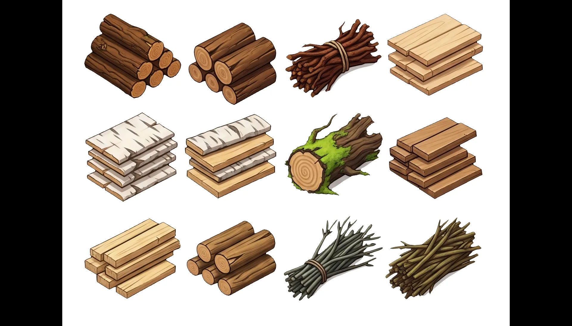 Набор из 12 иконок дерева и досок — от свежеспиленных брёвен и аккуратно сложенных досок до деревянных ящиков, балок и бочек. В коллекции есть даже резные элементы и связки поленьев, подчёркивающие разнообразие и атмосферу ремесла. Каждая иконка детально проработана и сохраняет узнаваемый характер древесины — с текстурой, сучками и оттенками, создавая цельный и выразительный набор.