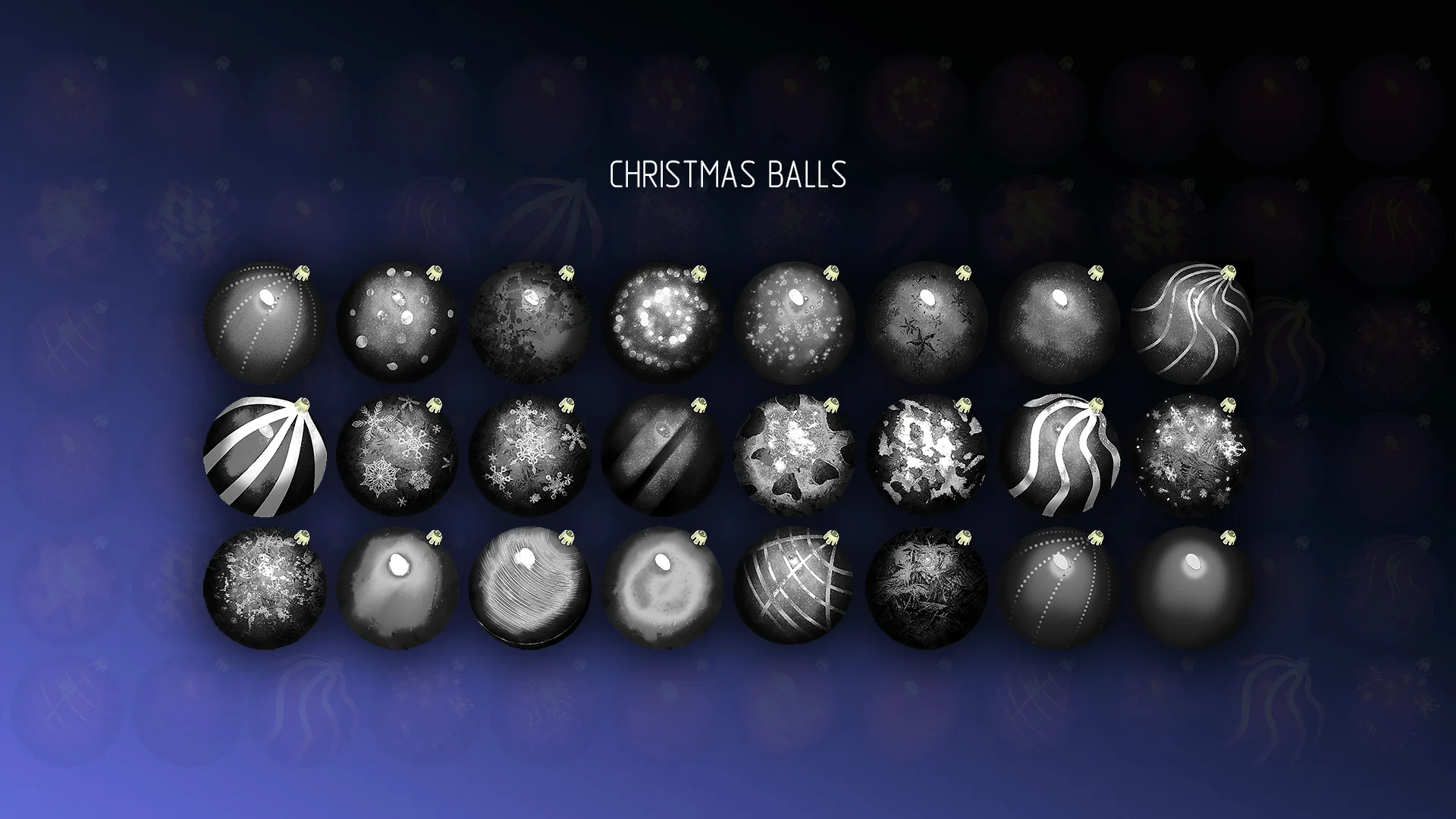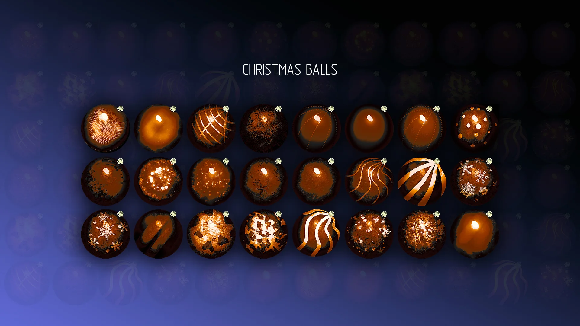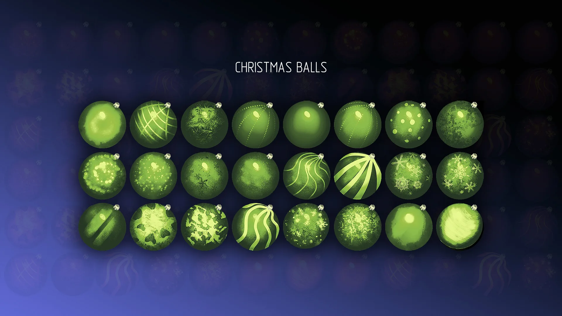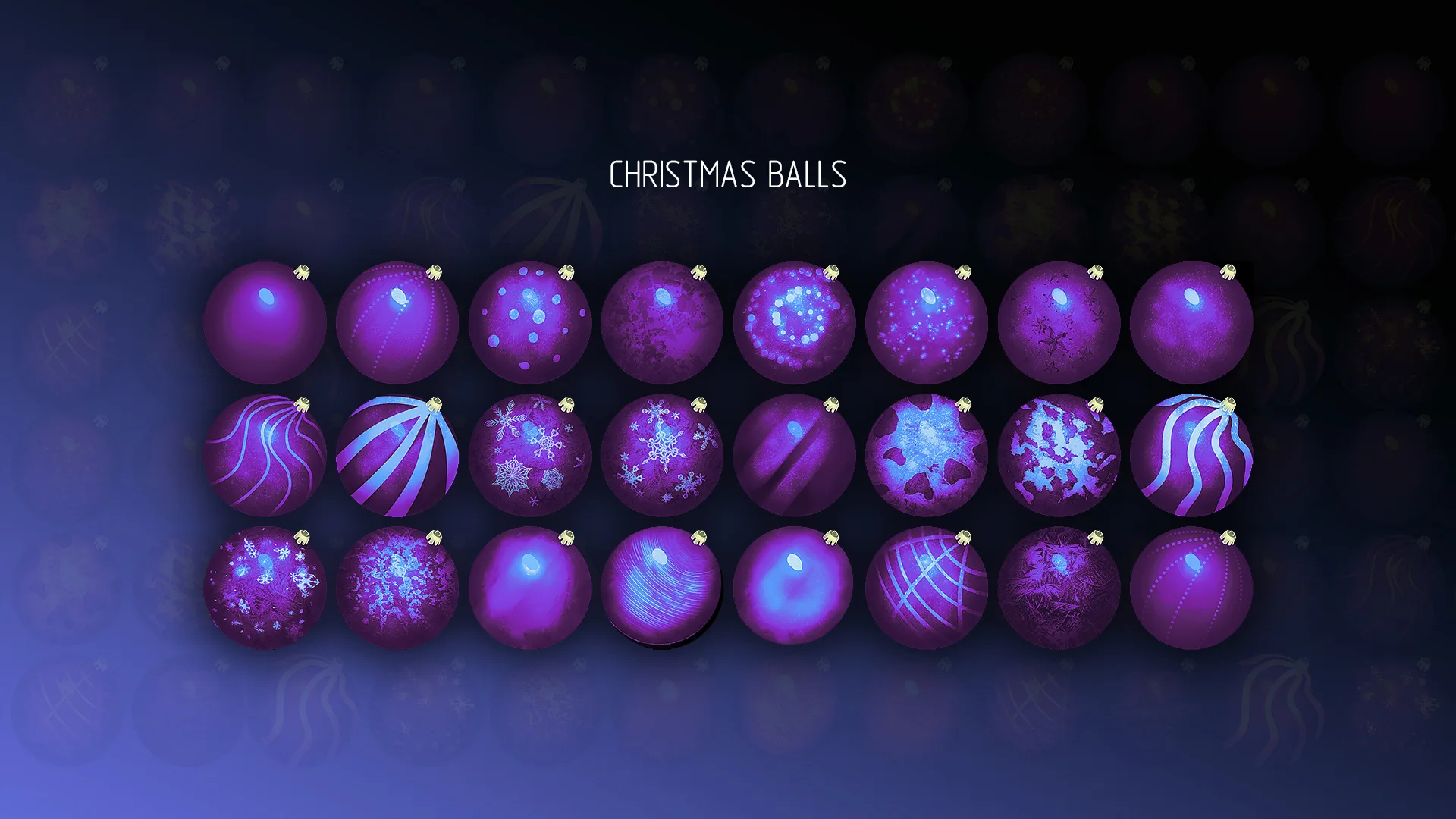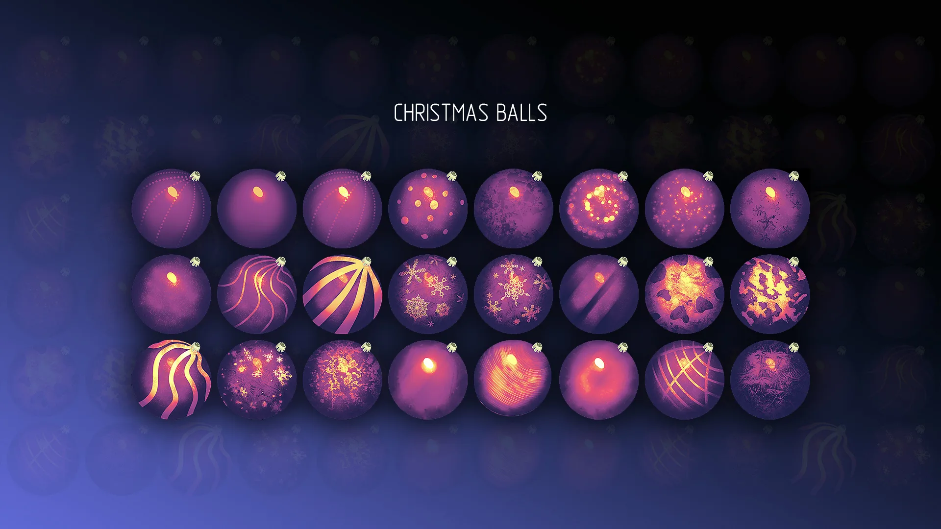 Colorful colorful Christmas Balls to decorate your projects, postcards, graphical interfaces, background screensavers, models, sprites, textures, etc. Unique multi-color structure of each ball. High quality hand-drawn images.