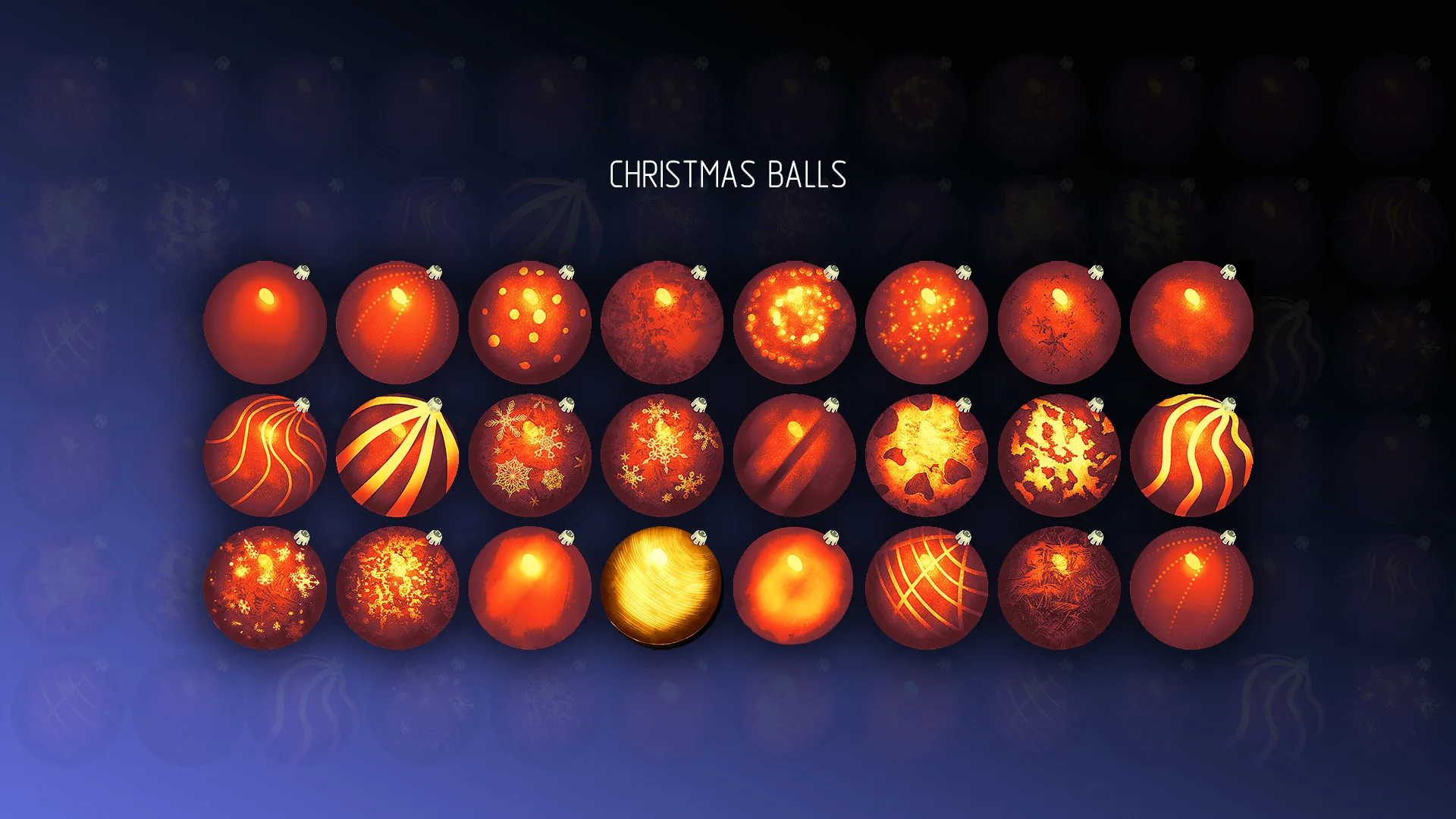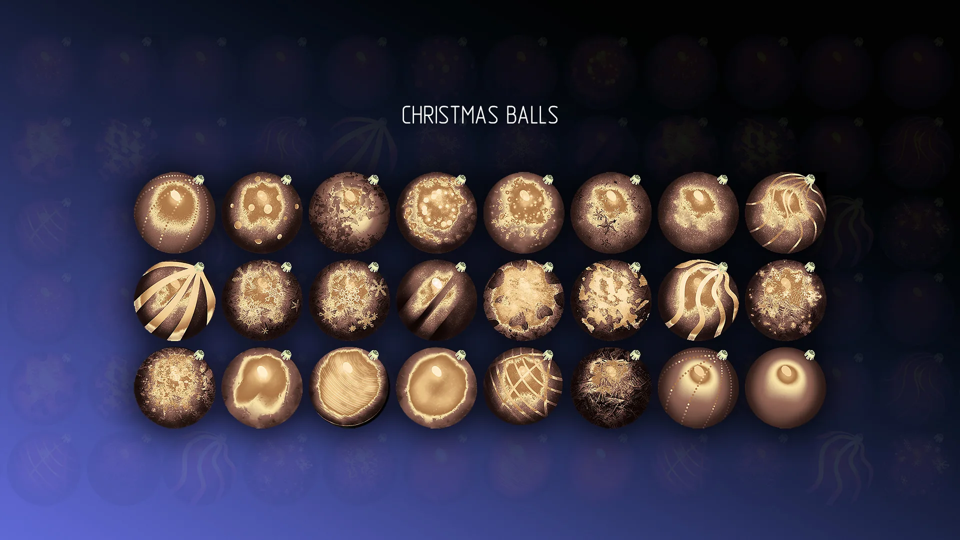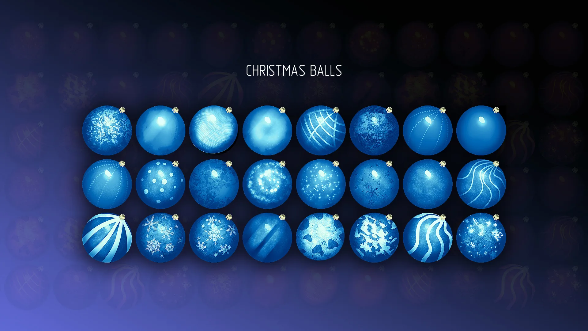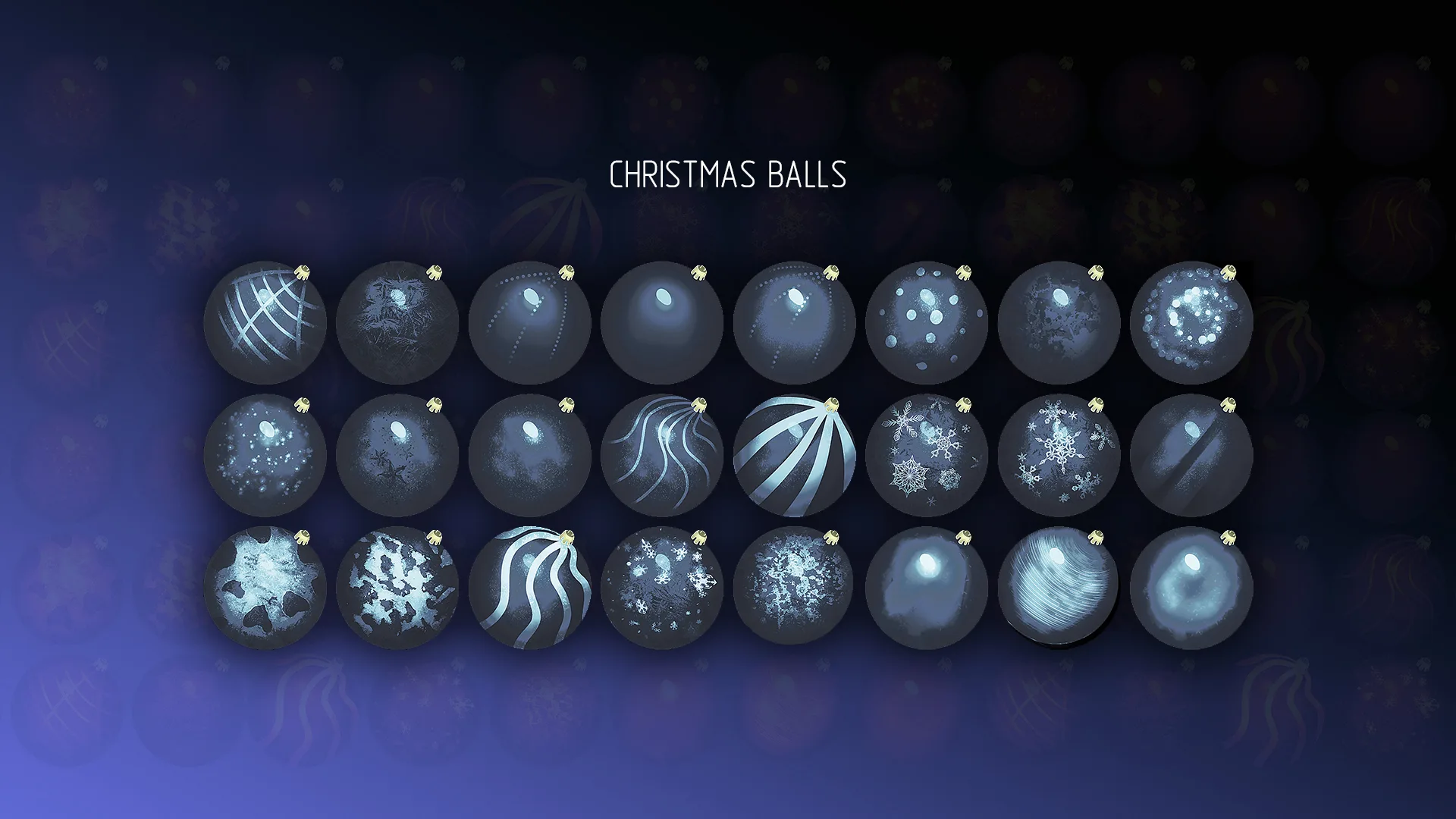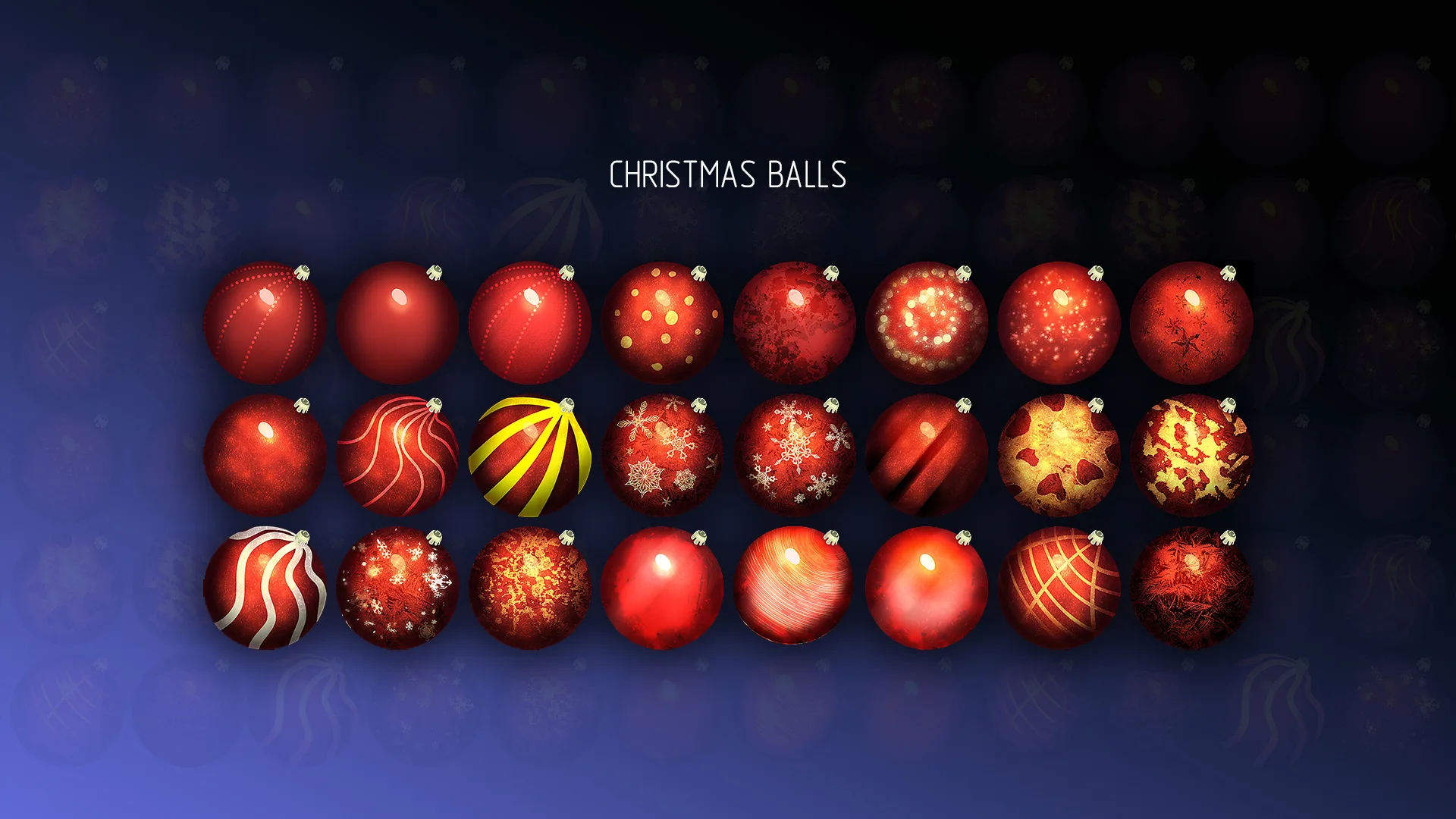 Colorful colorful Christmas Balls to decorate your projects, postcards, graphical interfaces, background screensavers, models, sprites, textures, etc. Unique multi-color structure of each ball. High quality hand-drawn images.