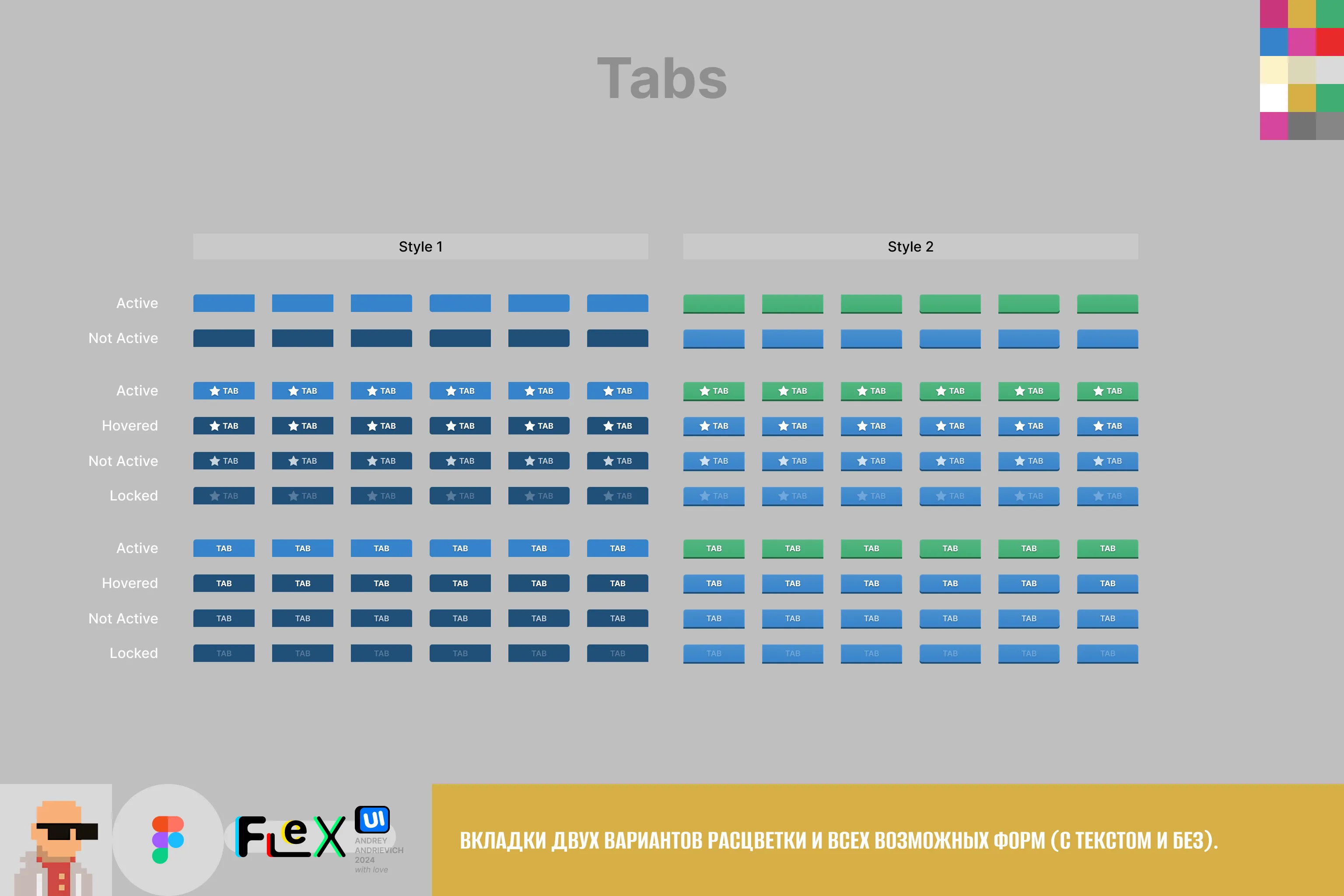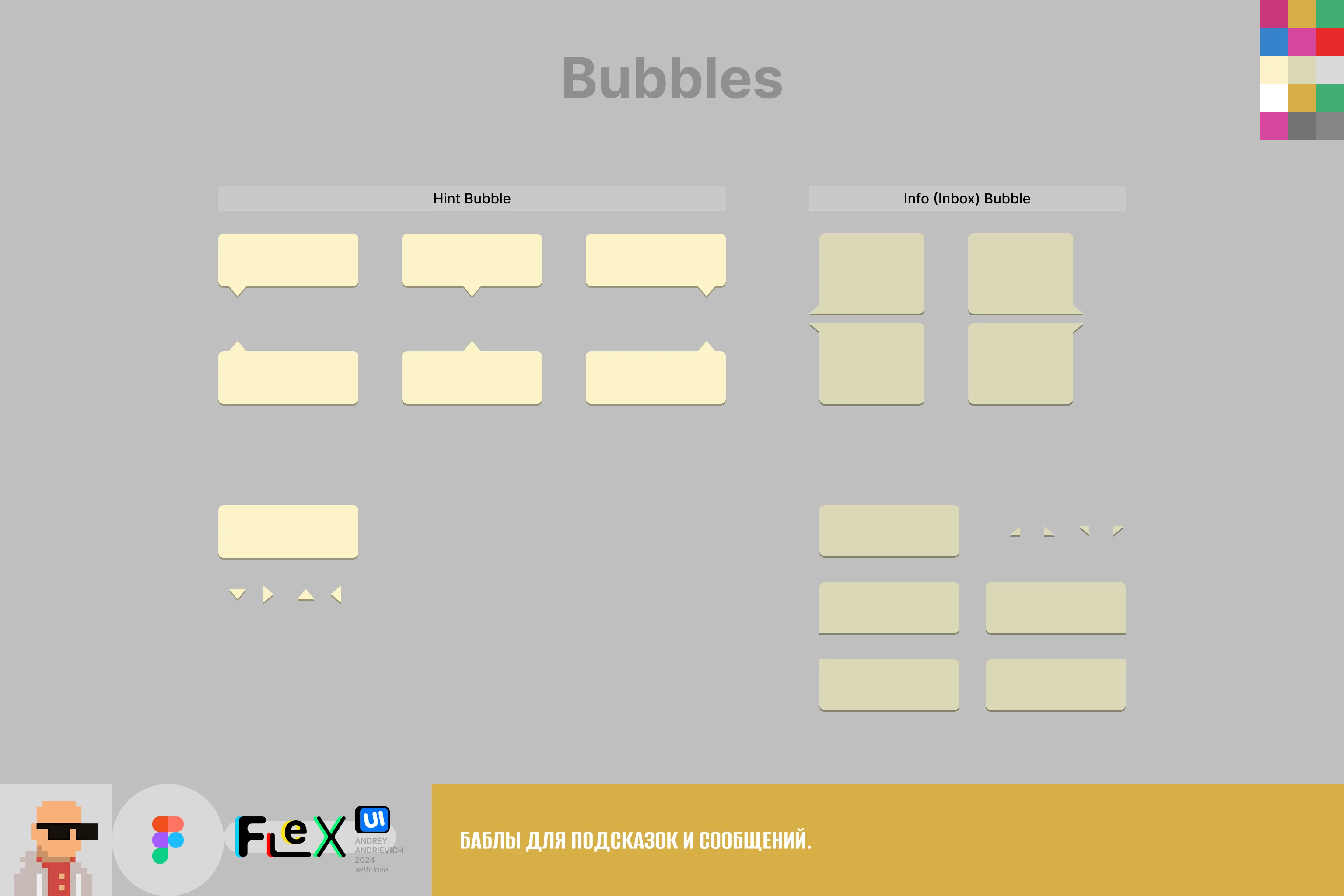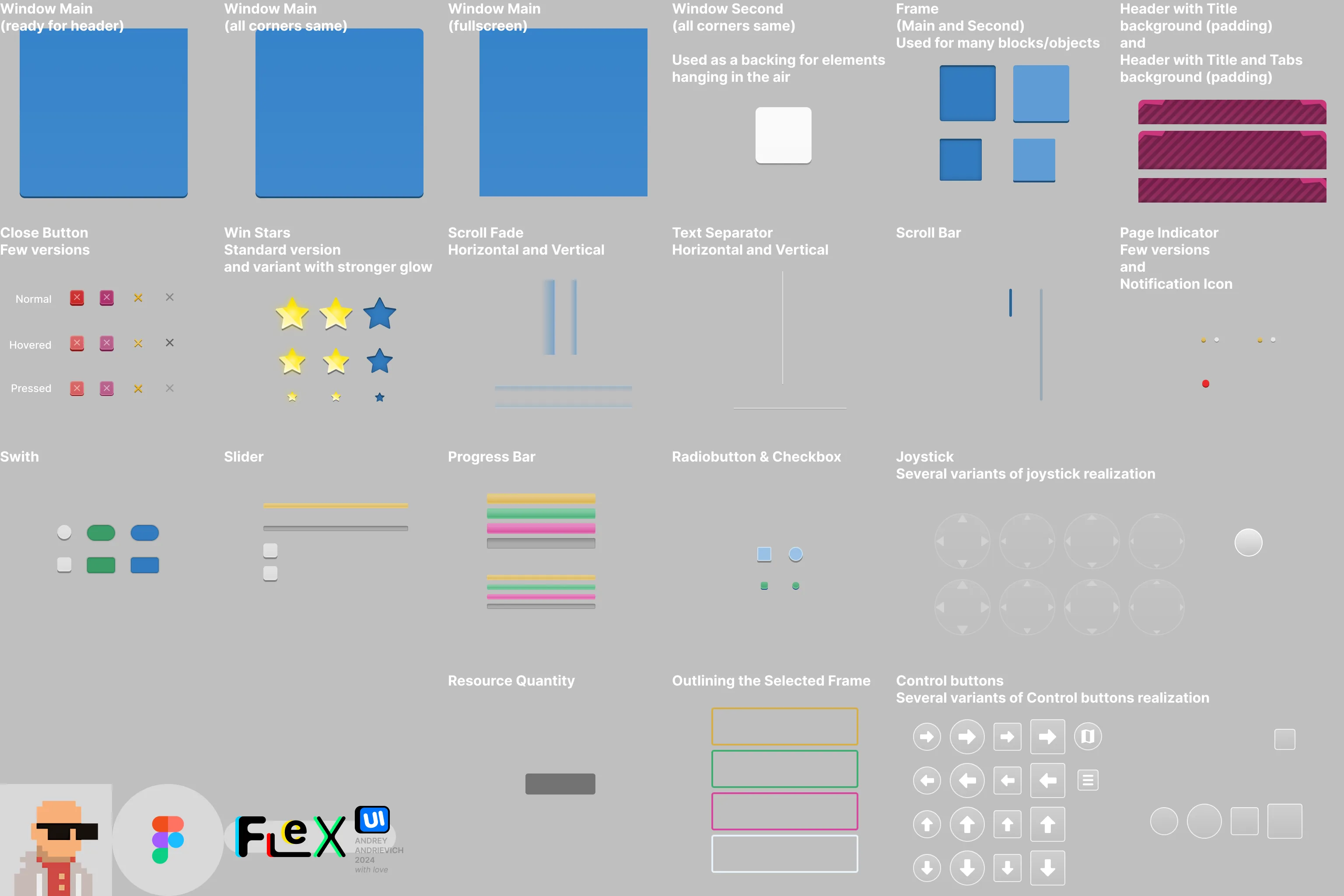 - All elements necessary for interface creation: buttons, tabs, switchers, sliders, progress bars, frames, checkbox and radiobutton, bubble prompts, joysticks and other control buttons, font styles (inside Figma file), swipe and scroll indicators and many others. Some elements have several implementation variants.