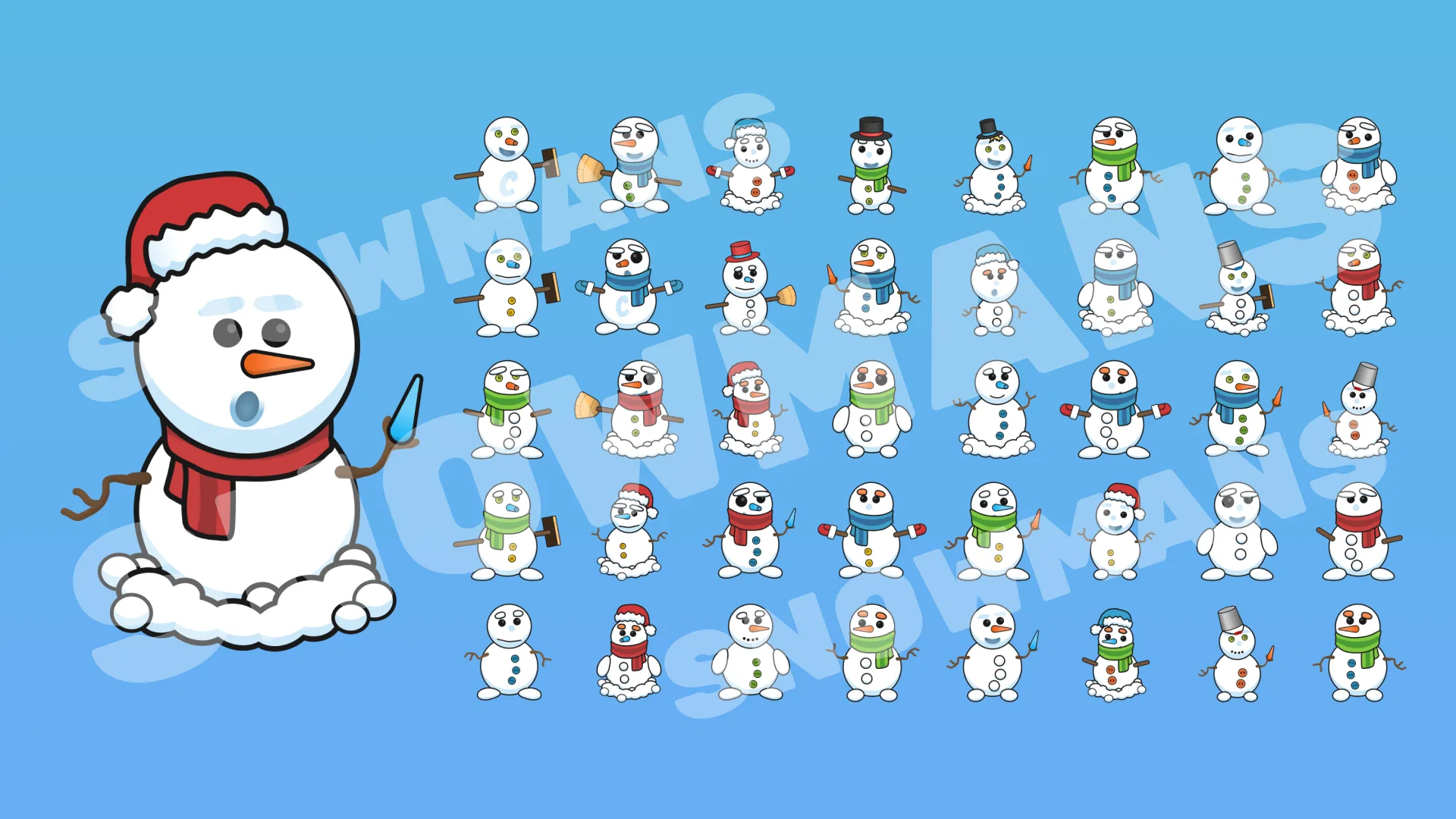 Looking for the perfect graphics for your game? In this set you will find 105 funny snowmen, each ready to add fun and joy to your project. This is the perfect choice for developing winter adventure games, clickers and other fun projects!