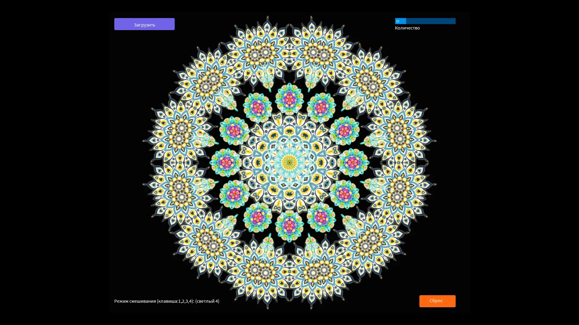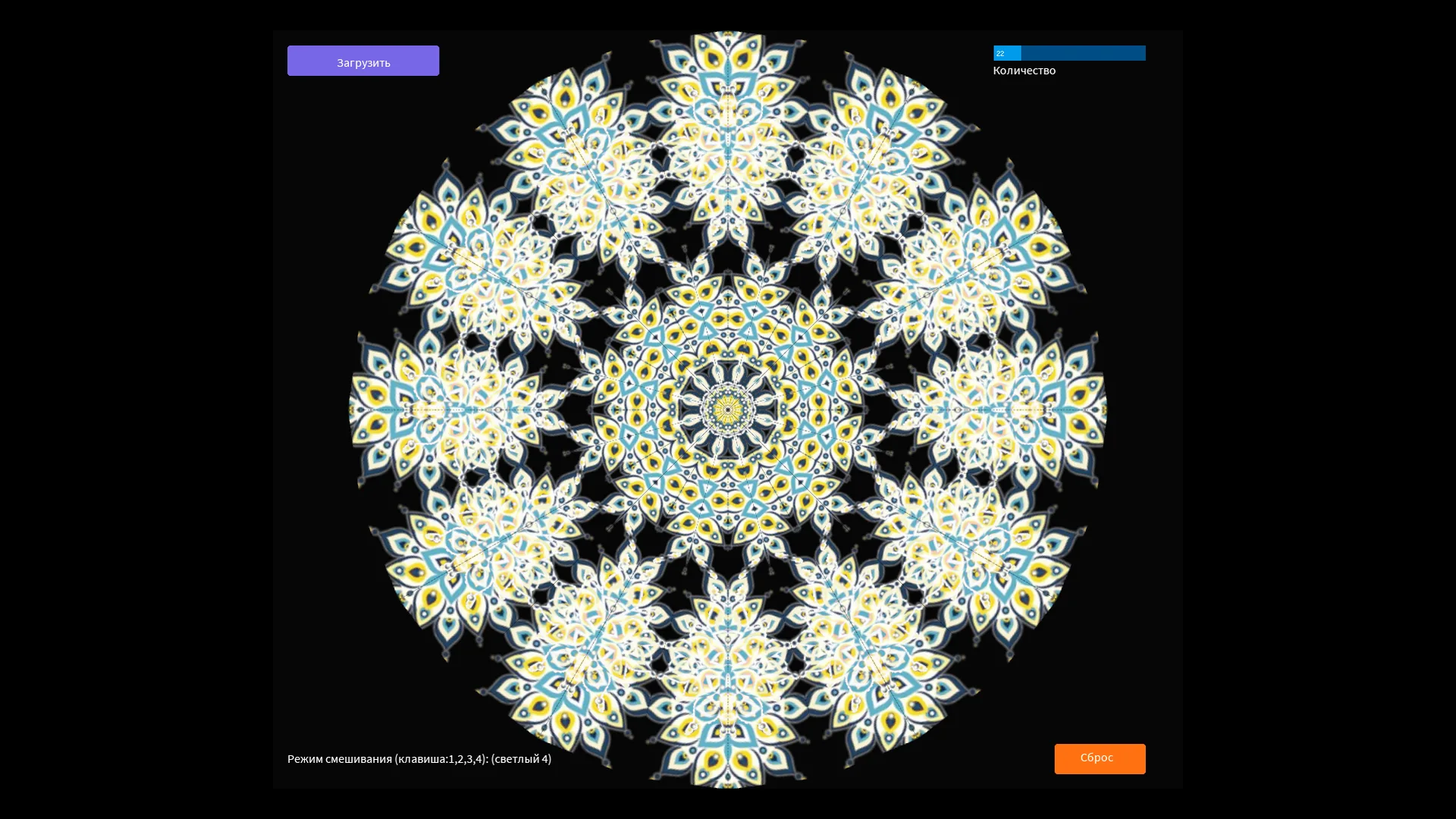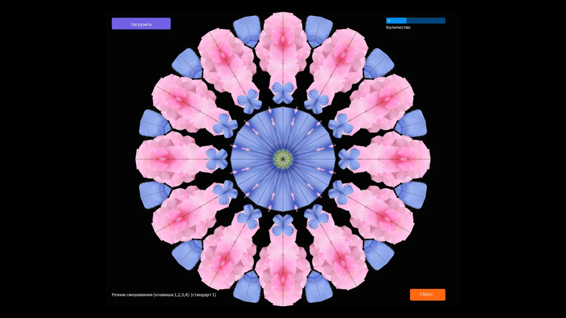 Плен симметрии! Хочешь получить залипательную симметрию? Тогда вставь картинку и получишь калейдоскопический эффект. В папке " dat" находятся примеры изображений. Кнопками 1, 2, 3, 4 можно менять режим смешивания.