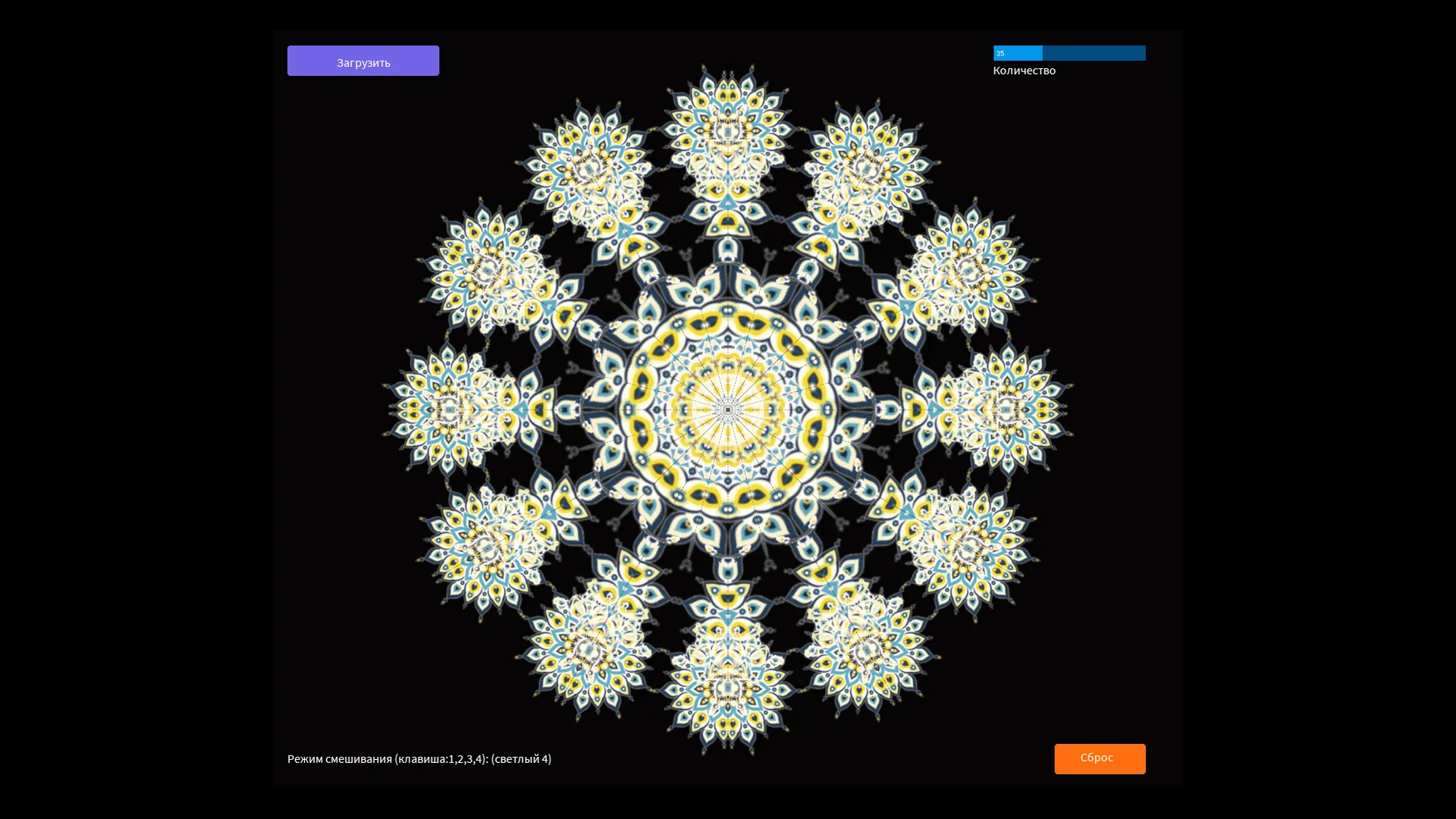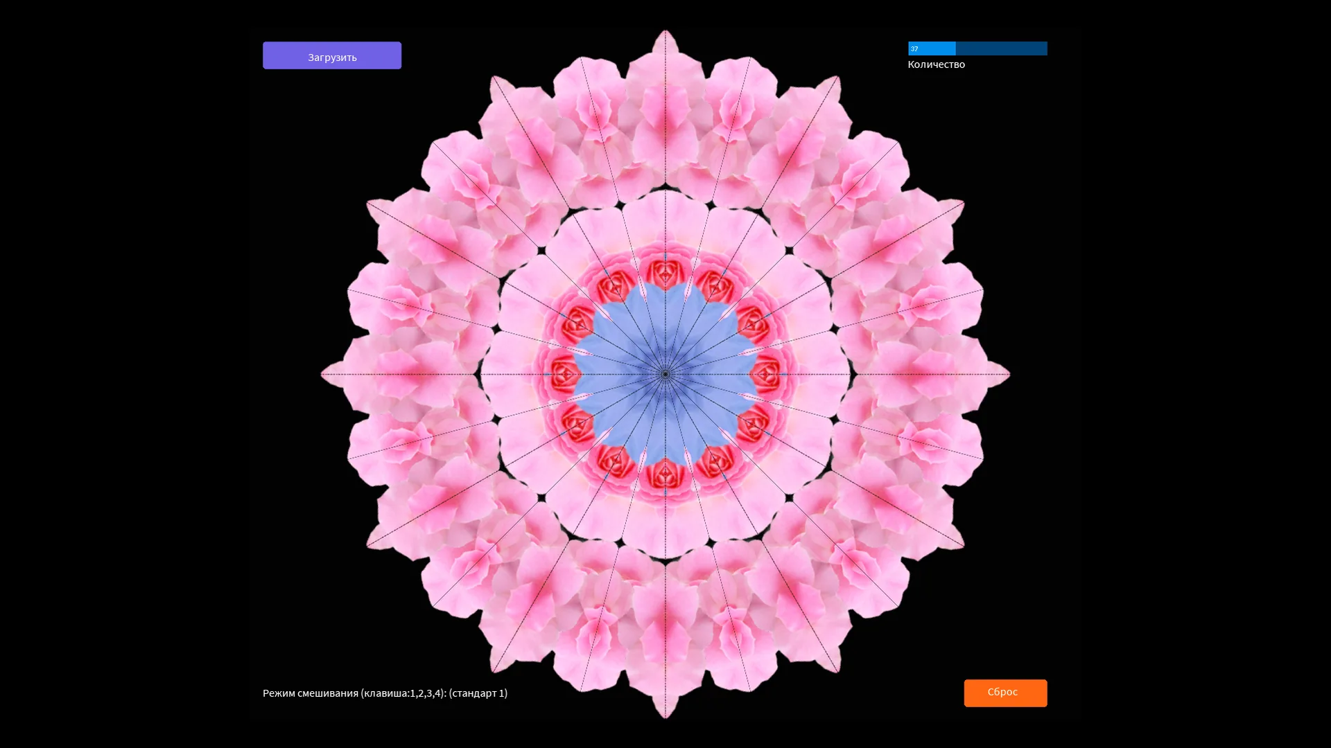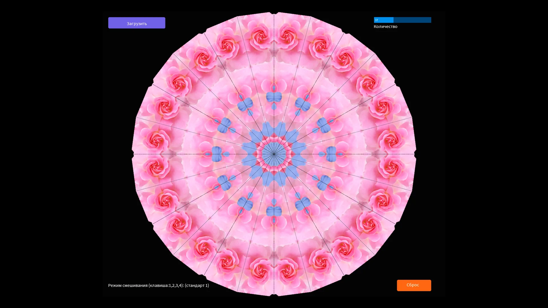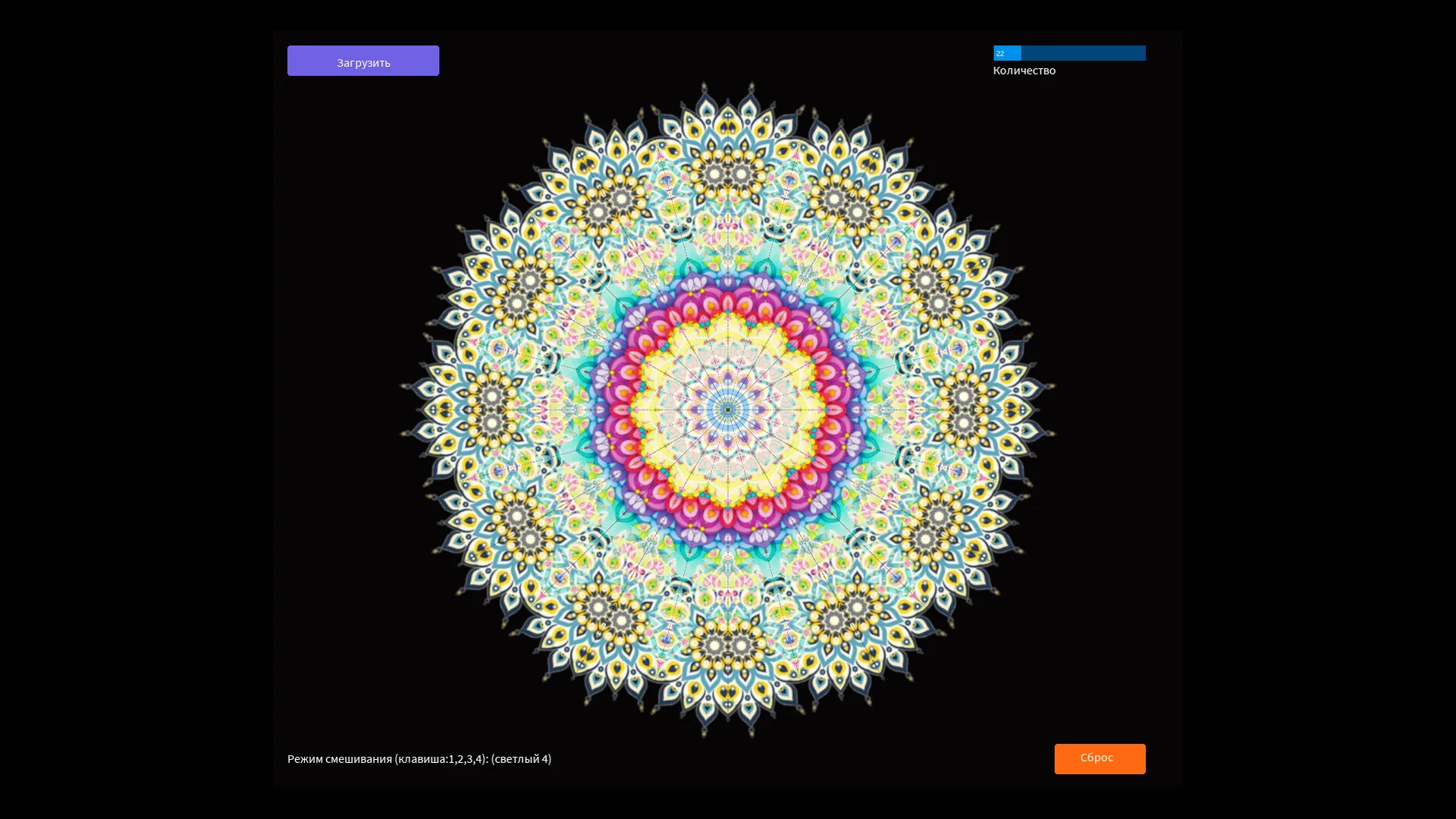 Плен симметрии! Хочешь получить залипательную симметрию? Тогда вставь картинку и получишь калейдоскопический эффект. В папке " dat" находятся примеры изображений. Кнопками 1, 2, 3, 4 можно менять режим смешивания.